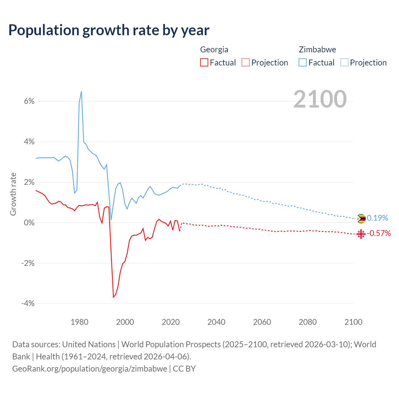 - For the last 10 years, Georgia has had an average growth rate of -0.04% per year vs +1.57% in Zimbabwe.