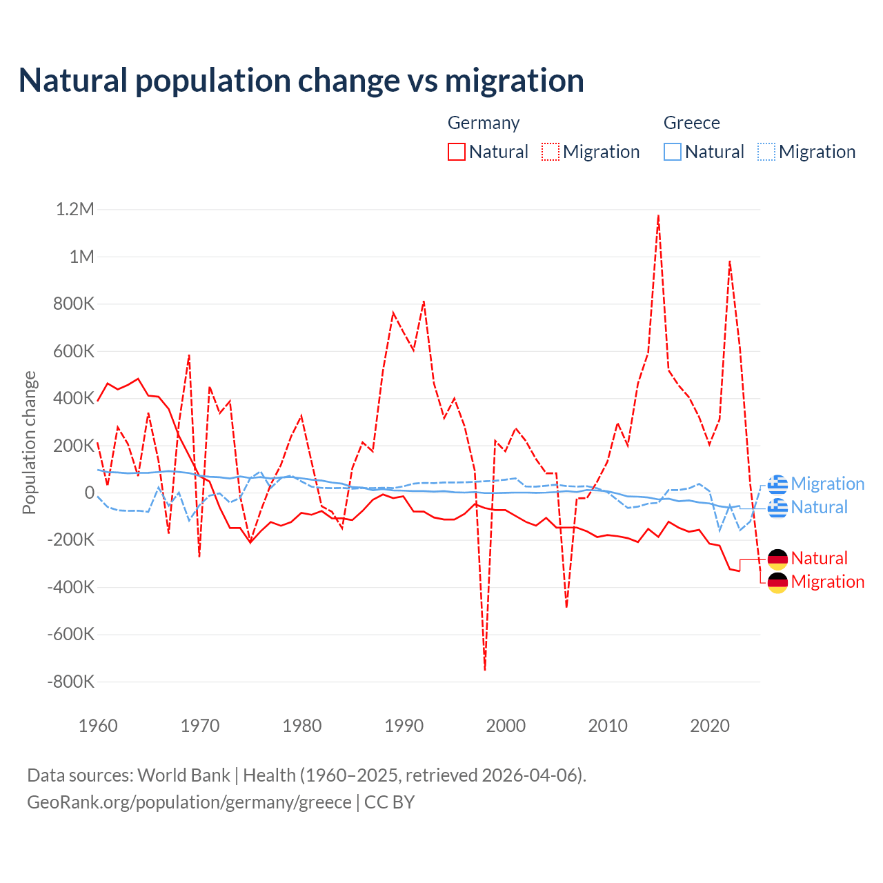 Over the last 10 years, 26.8% of the population change in Germany is from natural causes (a loss of 2,036,130 people) and 73.2% is from migration (a gain of 5,565,916 people). In Greece 51.9% is from natural causes (a loss of 411,426 people) and 48.1% is from migration (a loss of 381,824 people).
