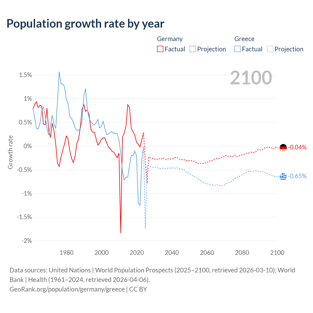 Data sources: World Bank | Health (1960–2024, retrieved 2026-04-06); United Nations | World Population Prospects (1960–2026, retrieved 2026-03-10); U.S. Census Bureau (1960–2025, retrieved 2026-02-08); Central Intelligence Agency (CIA) (2000–2019, retrieved 2026-02-20).