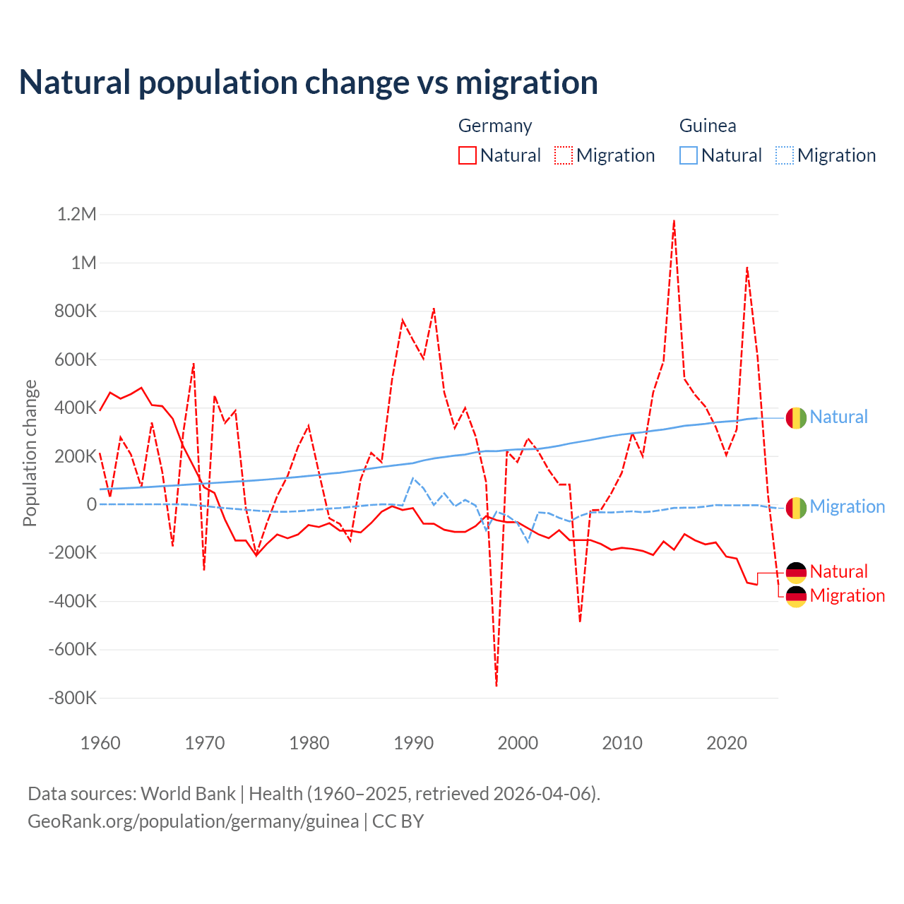 Over the last 10 years, 26.8% of the population change in Germany is from natural causes (a loss of 2,036,130 people) and 73.2% is from migration (a gain of 5,565,916 people). In Guinea 97.2% is from natural causes (a gain of 3,346,936 people) and 2.76% is from migration (a loss of 94,924 people).