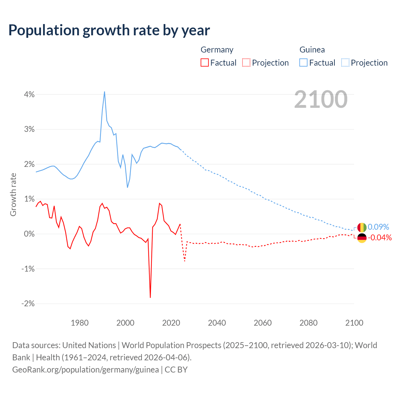 - For the last 10 years, Germany has had an average growth rate of +0.32% per year vs +2.54% in Guinea.