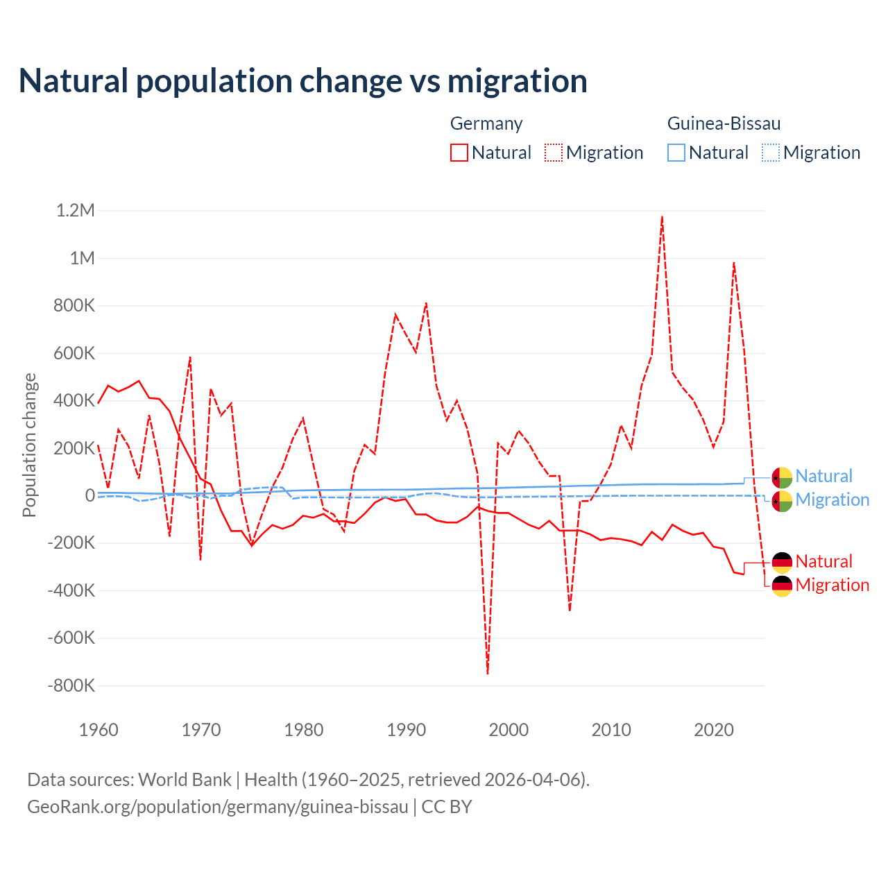 Over the last 10 years, 26.8% of the population change in Germany is from natural causes (a loss of 2,036,130 people) and 73.2% is from migration (a gain of 5,565,916 people). In Guinea-Bissau 97.1% is from natural causes (a gain of 472,826 people) and 2.87% is from migration (a loss of 13,956 people).