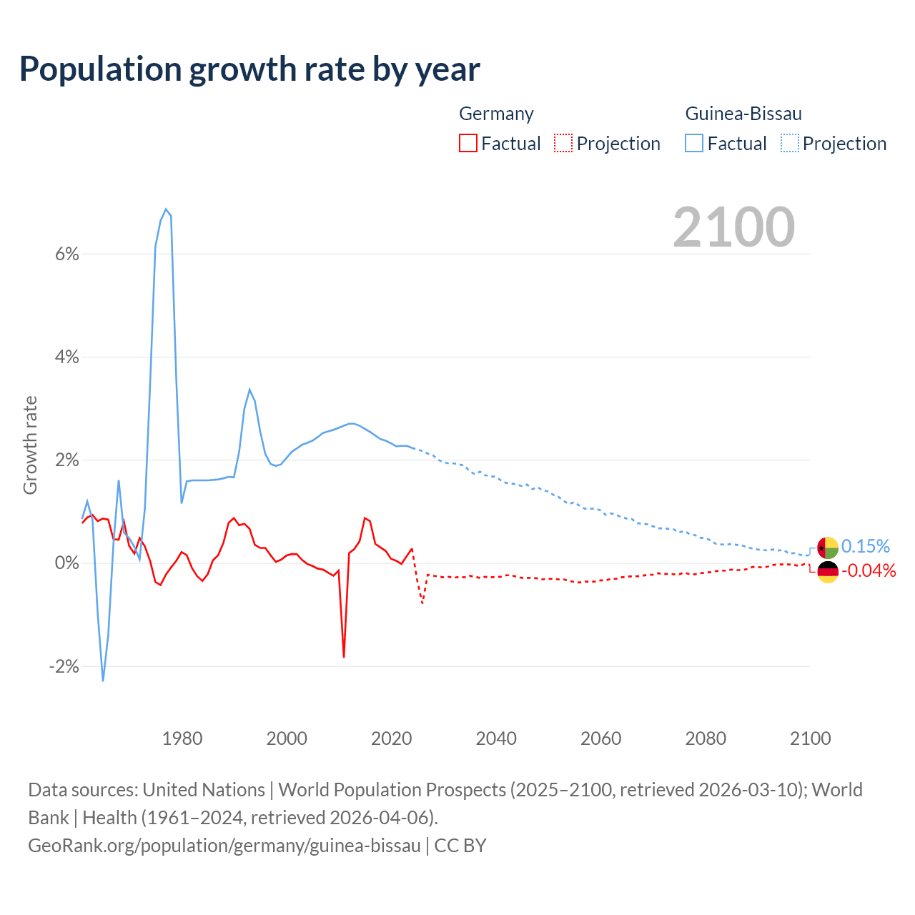 - For the last 10 years, Germany has had an average growth rate of +0.32% per year vs +2.4% in Guinea-Bissau.