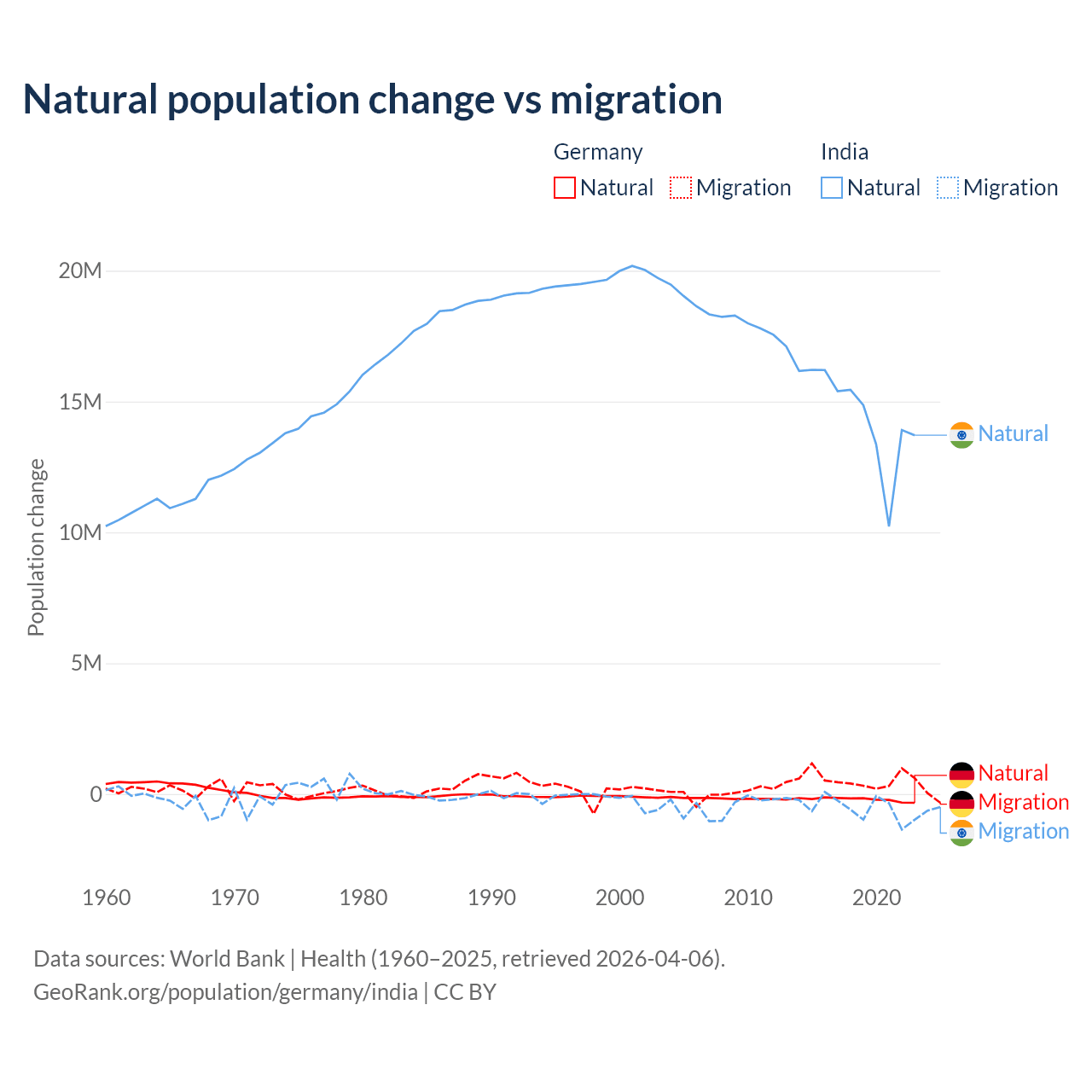 Over the last 10 years, 26.8% of the population change in Germany is from natural causes (a loss of 2,036,130 people) and 73.2% is from migration (a gain of 5,565,916 people). In India 96.4% is from natural causes (a gain of 145,503,378 people) and 3.56% is from migration (a loss of 5,376,884 people).