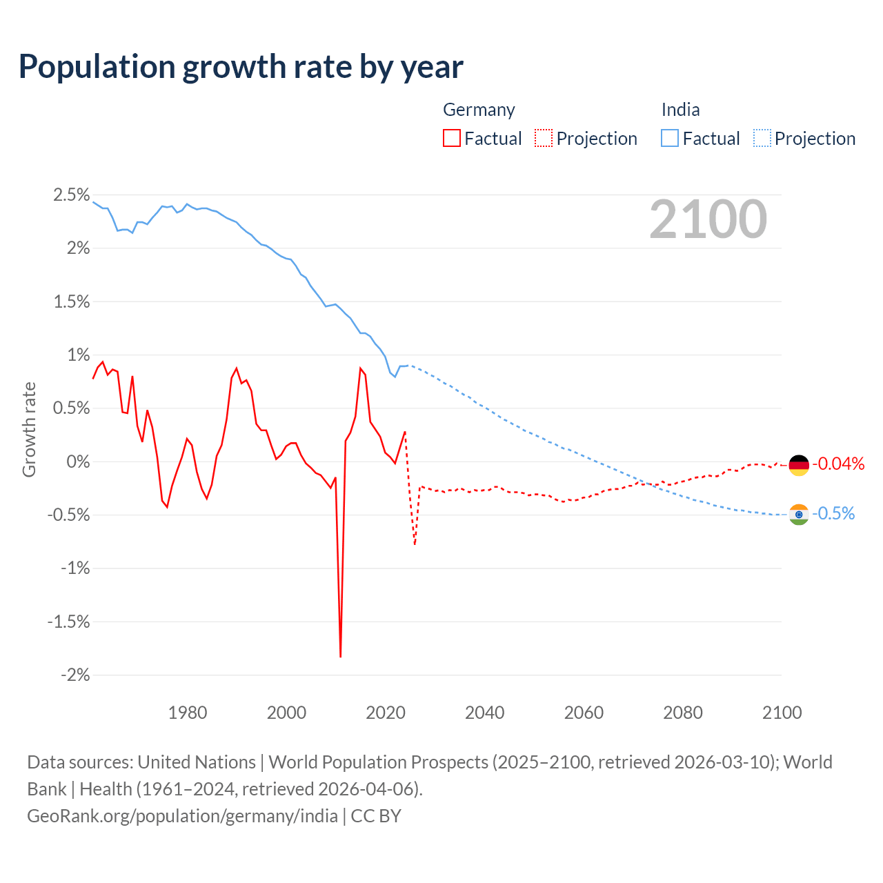 - For the last 10 years, Germany has had an average growth rate of +0.32% per year vs +1.03% in India.