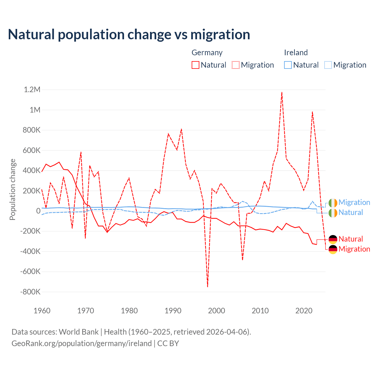 Over the last 10 years, 26.8% of the population change in Germany is from natural causes (a loss of 2,036,130 people) and 73.2% is from migration (a gain of 5,565,916 people). In Ireland 48.2% is from natural causes (a gain of 284,644 people) and 51.8% is from migration (a gain of 305,297 people).