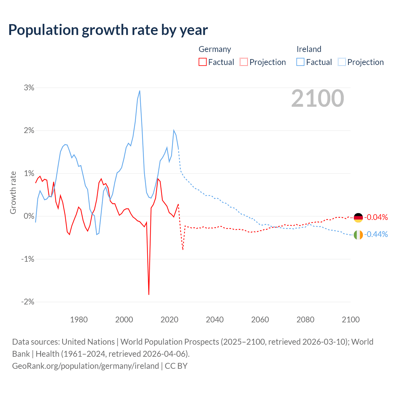 - For the last 10 years, Germany has had an average growth rate of +0.32% per year vs +1.41% in Ireland.