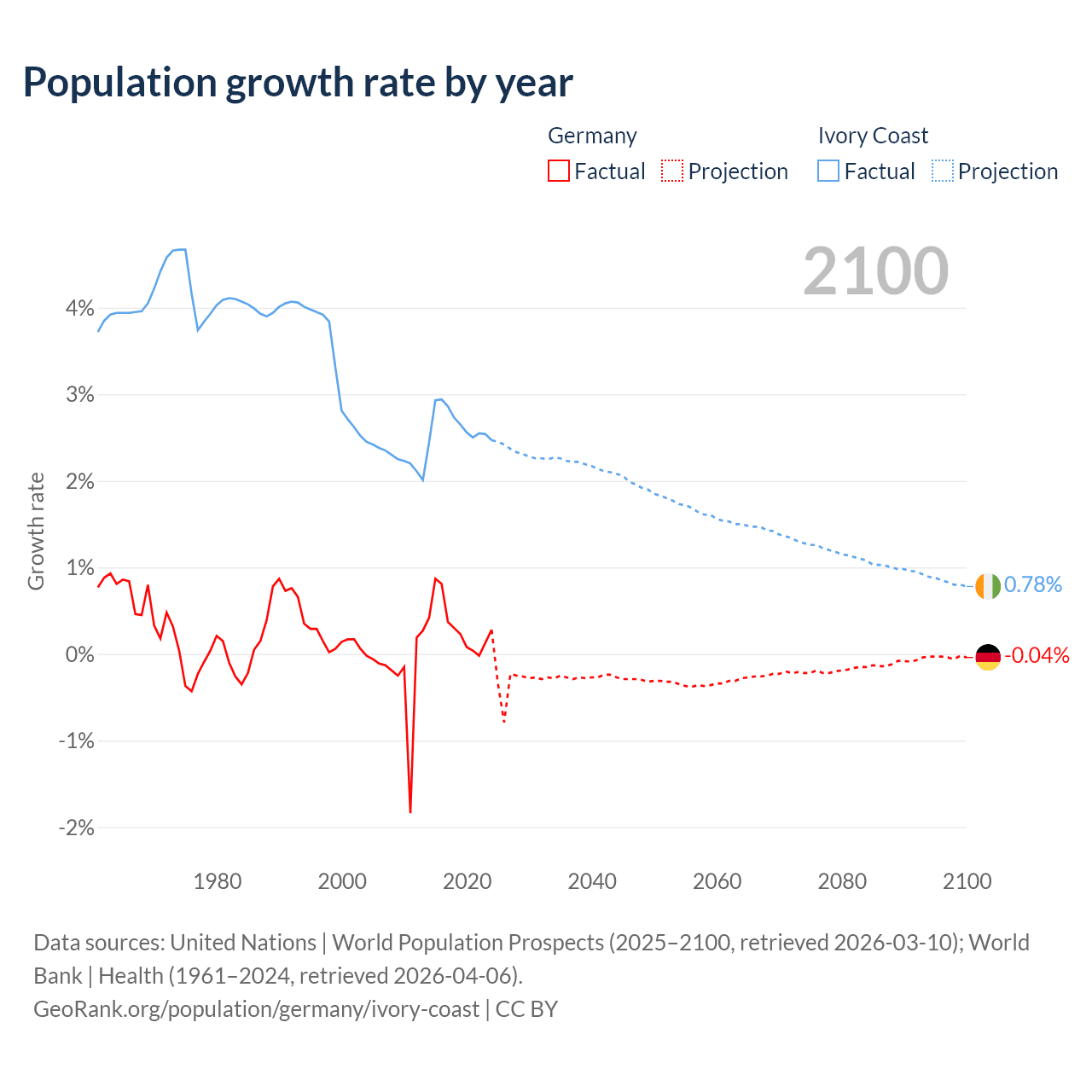 - For the last 10 years, Germany has had an average growth rate of +0.32% per year vs +2.65% in Ivory Coast.