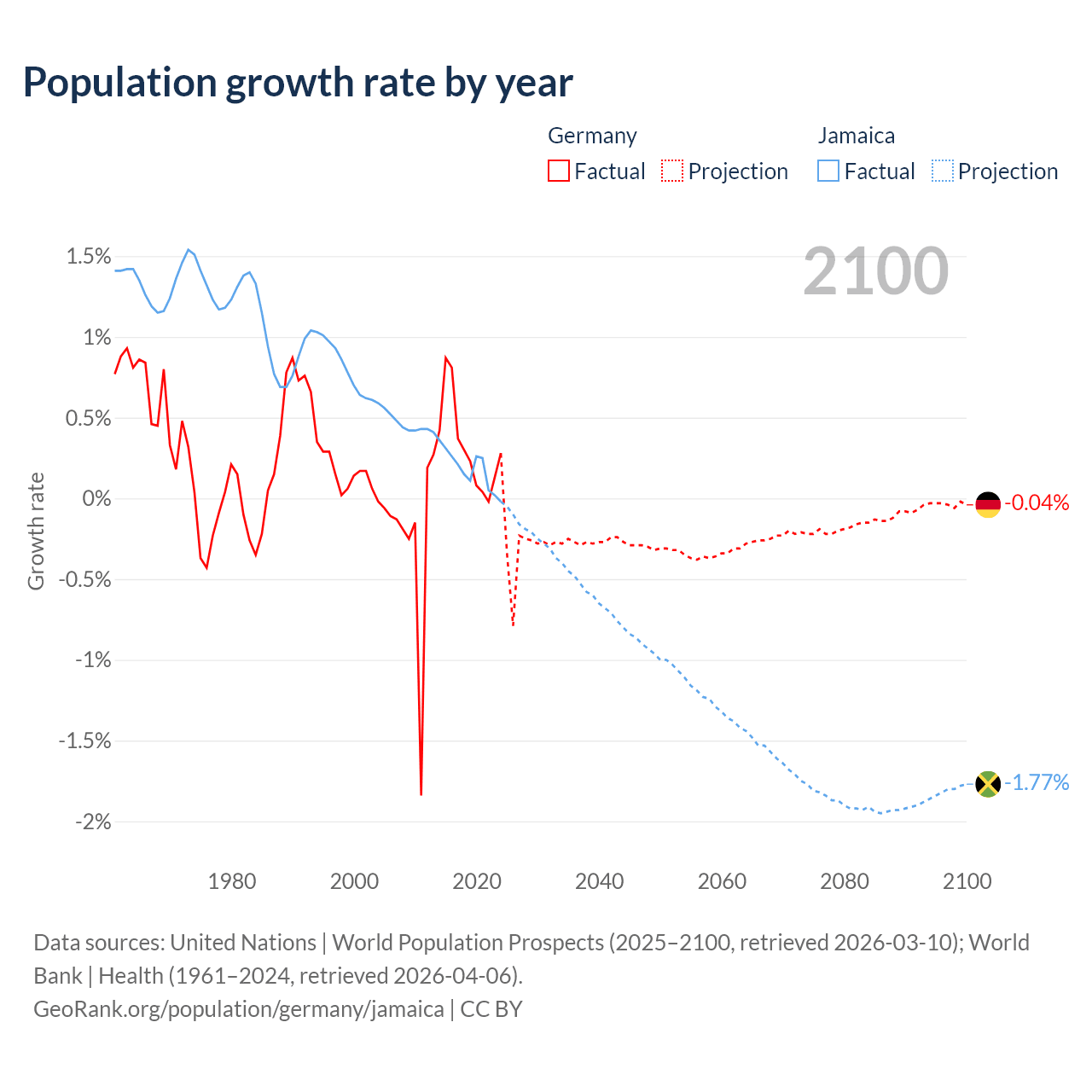 - For the last 10 years, Germany has had an average growth rate of +0.32% per year vs +0.18% in Jamaica.