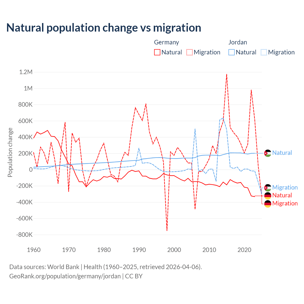Over the last 10 years, 26.8% of the population change in Germany is from natural causes (a loss of 2,036,130 people) and 73.2% is from migration (a gain of 5,565,916 people). In Jordan 63.2% is from natural causes (a gain of 1,991,452 people) and 36.8% is from migration (a gain of 1,157,625 people).