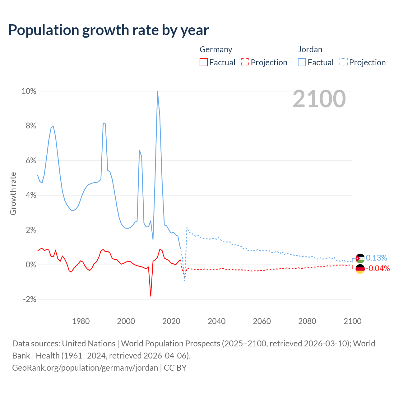 - For the last 10 years, Germany has had an average growth rate of +0.32% per year vs +3.45% in Jordan.