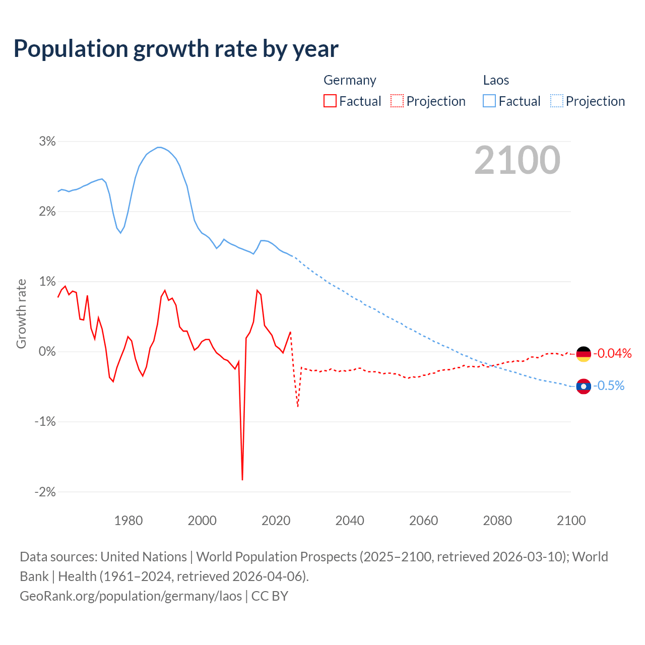 - For the last 10 years, Germany has had an average growth rate of +0.32% per year vs +1.48% in Laos.