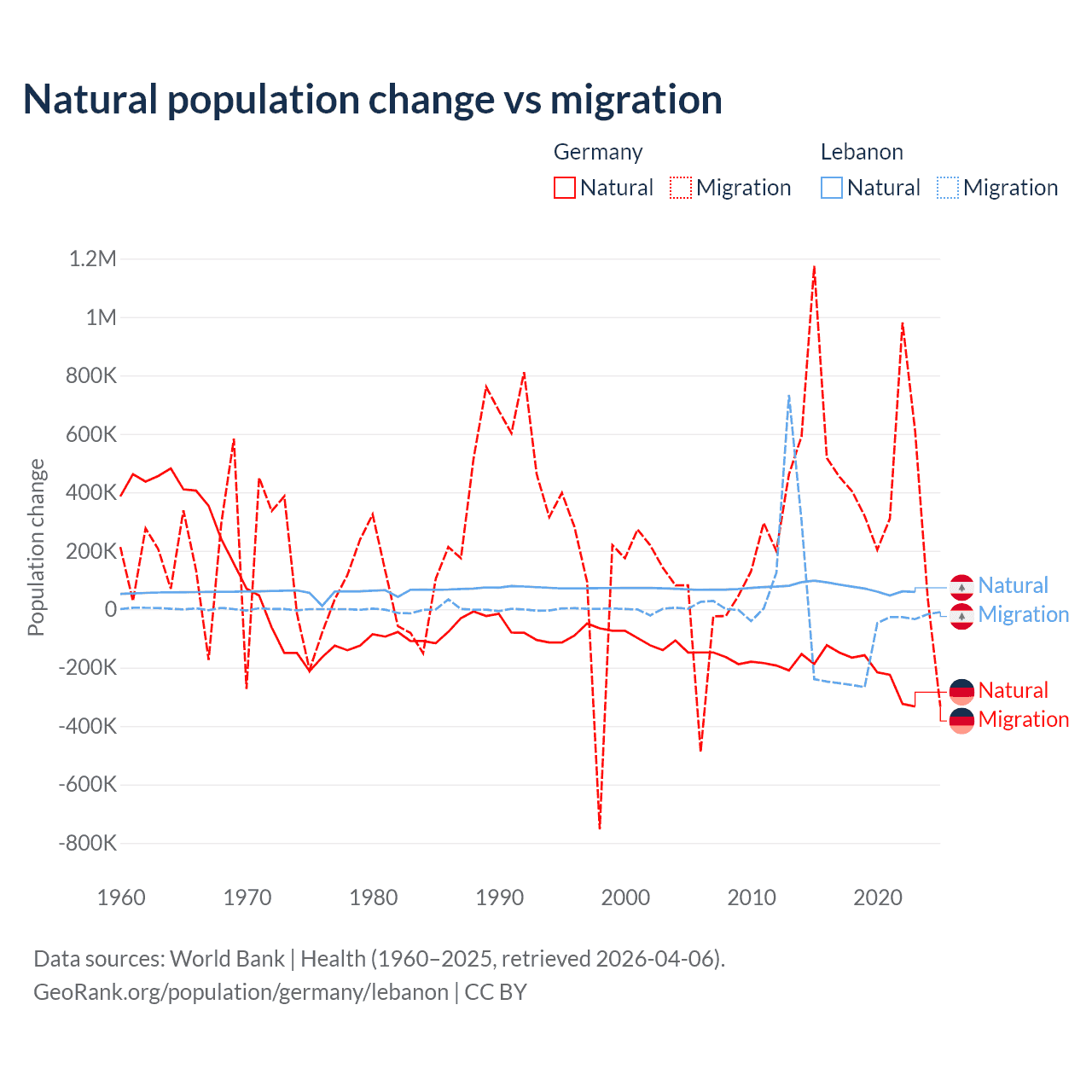 Over the last 10 years, 26.8% of the population change in Germany is from natural causes (a loss of 2,036,130 people) and 73.2% is from migration (a gain of 5,565,916 people). In Lebanon 40.1% is from natural causes (a gain of 739,256 people) and 59.9% is from migration (a loss of 1,103,772 people).