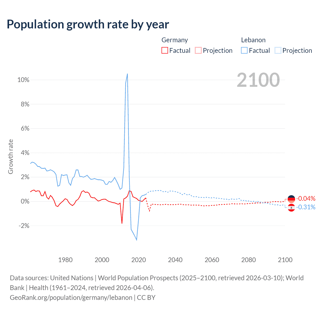 - For the last 10 years, Germany has had an average growth rate of +0.32% per year vs +0.16% in Lebanon.