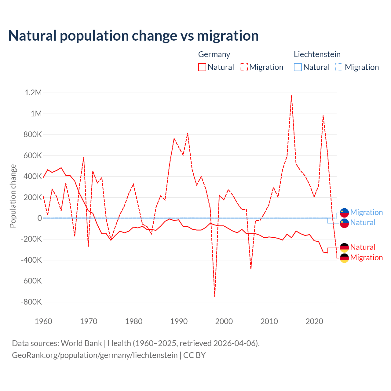 Over the last 10 years, 26.8% of the population change in Germany is from natural causes (a loss of 2,036,130 people) and 73.2% is from migration (a gain of 5,565,916 people). In Liechtenstein 32.4% is from natural causes (a gain of 883 people) and 67.6% is from migration (a gain of 1,843 people).