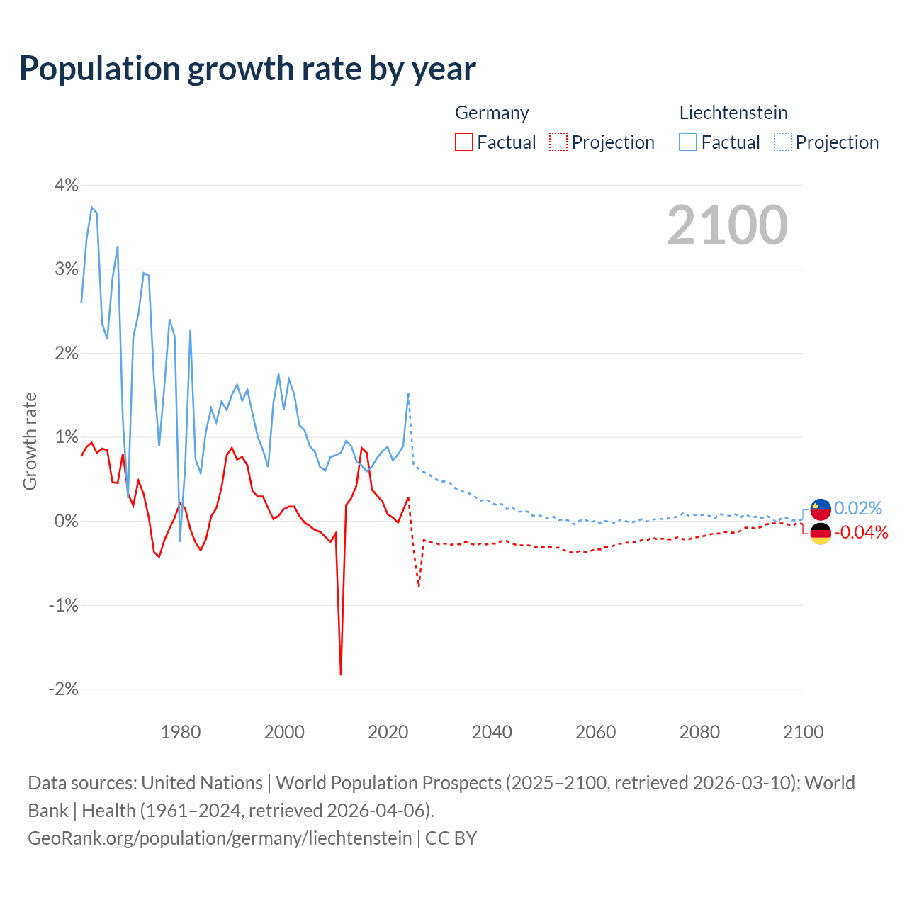 - For the last 10 years, Germany has had an average growth rate of +0.32% per year vs +0.82% in Liechtenstein.