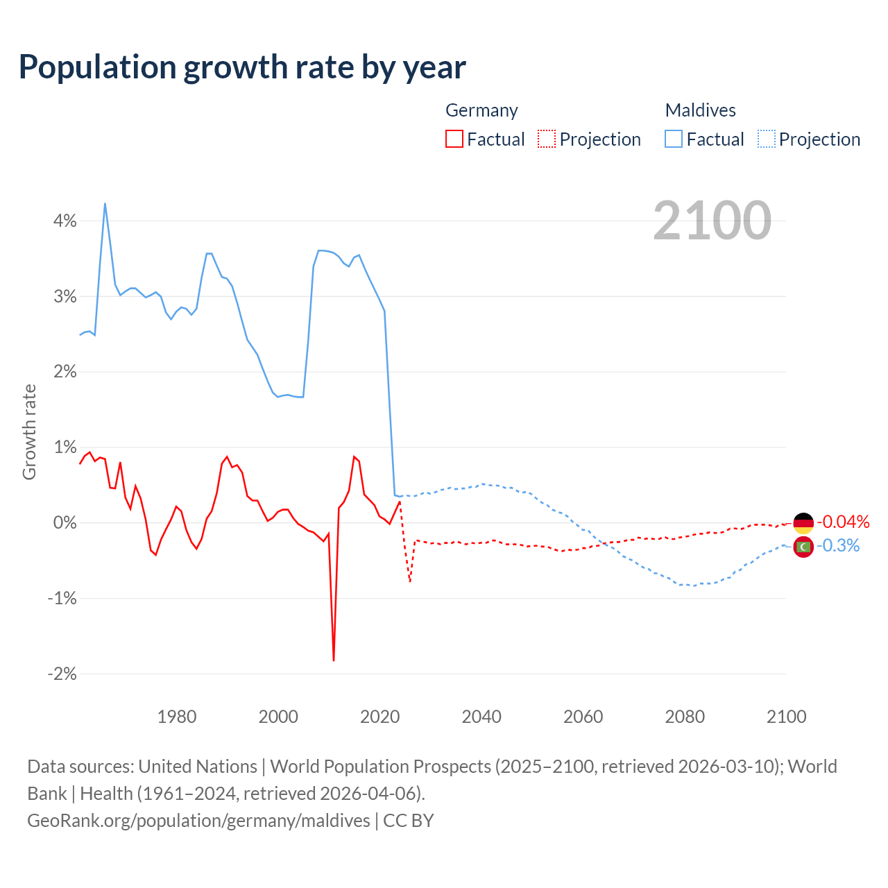 - For the last 10 years, Germany has had an average growth rate of +0.32% per year vs +2.56% in Maldives.