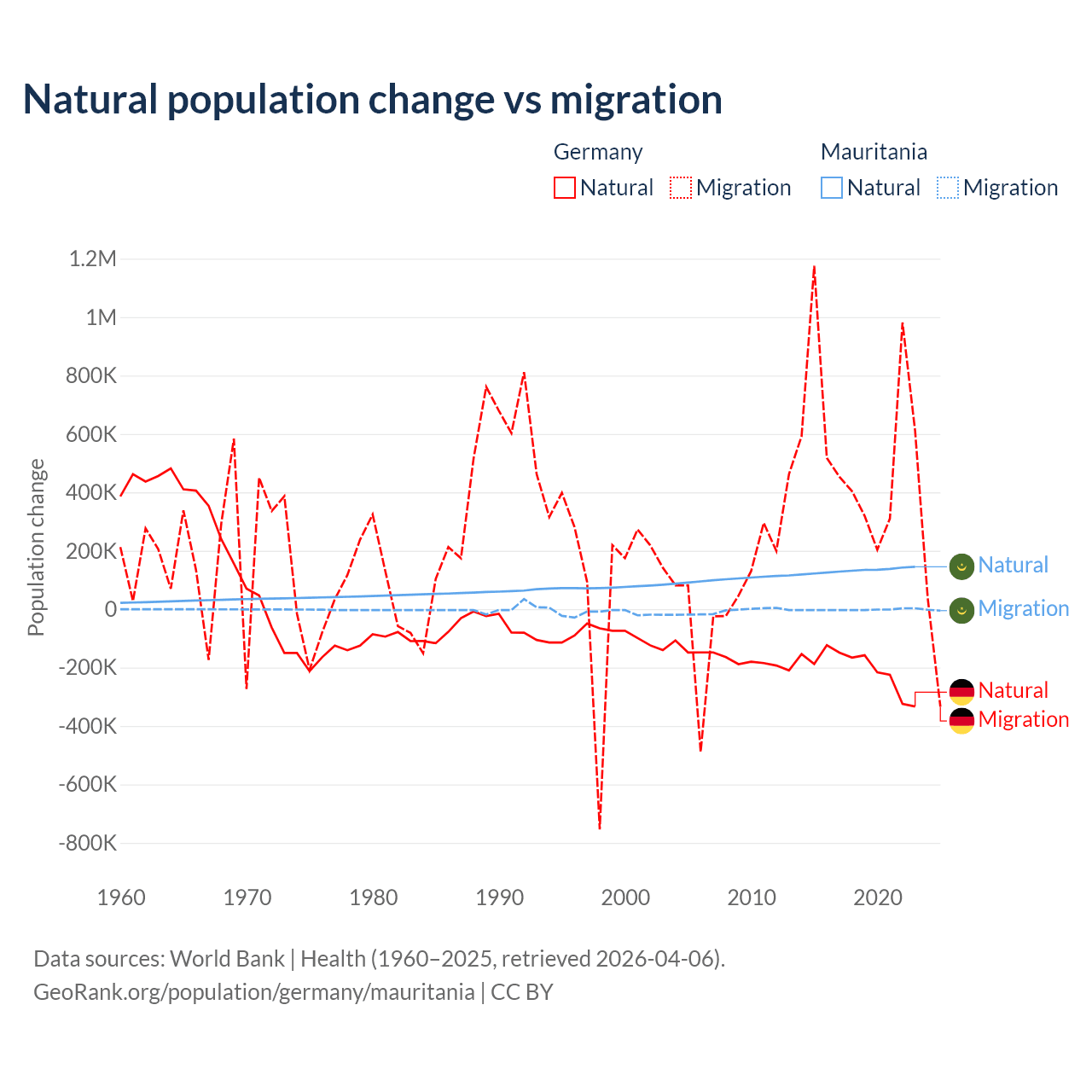 Over the last 10 years, 26.8% of the population change in Germany is from natural causes (a loss of 2,036,130 people) and 73.2% is from migration (a gain of 5,565,916 people). In Mauritania 98.9% is from natural causes (a gain of 1,320,903 people) and 1.12% is from migration (a loss of 14,982 people).