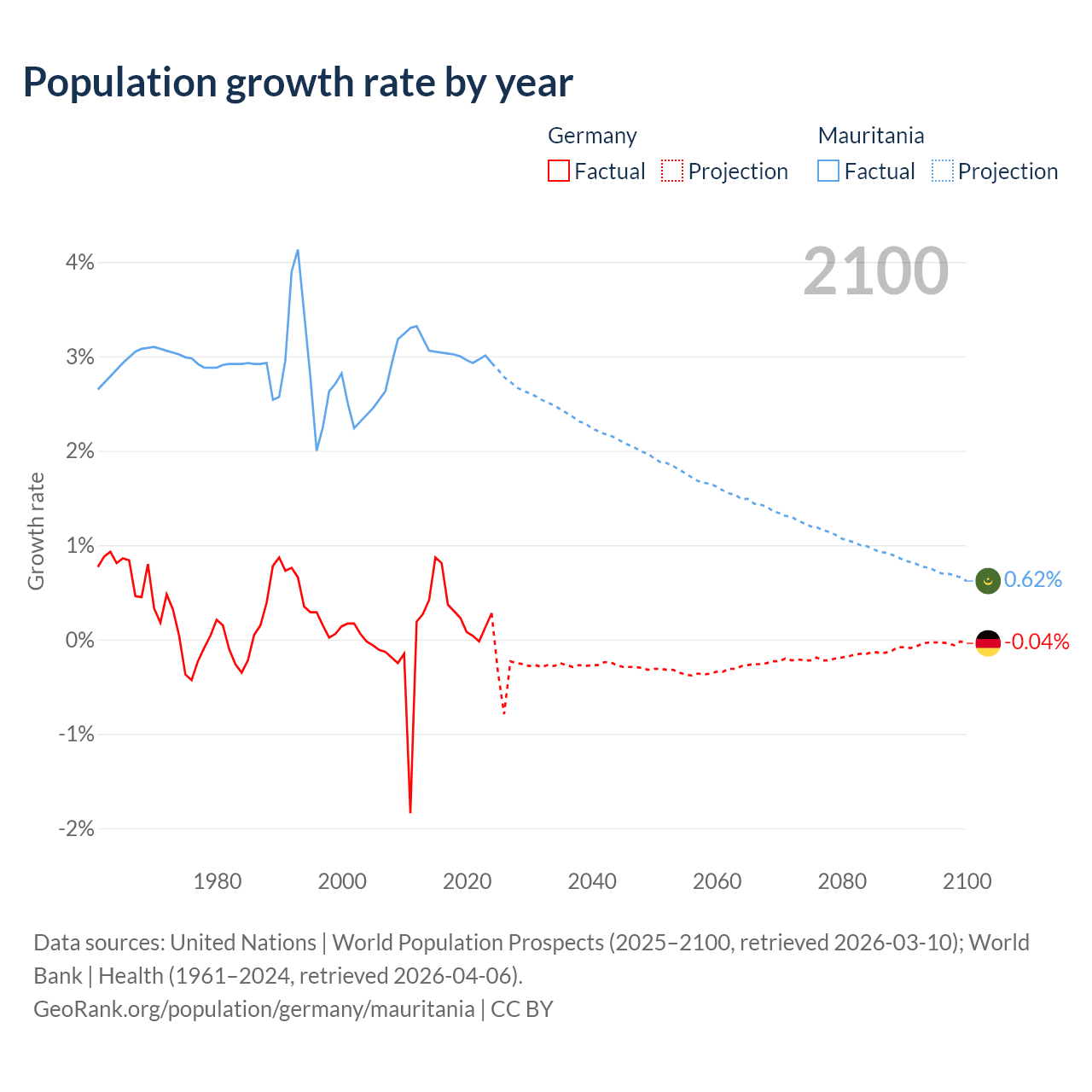 - For the last 10 years, Germany has had an average growth rate of +0.32% per year vs +3% in Mauritania.
