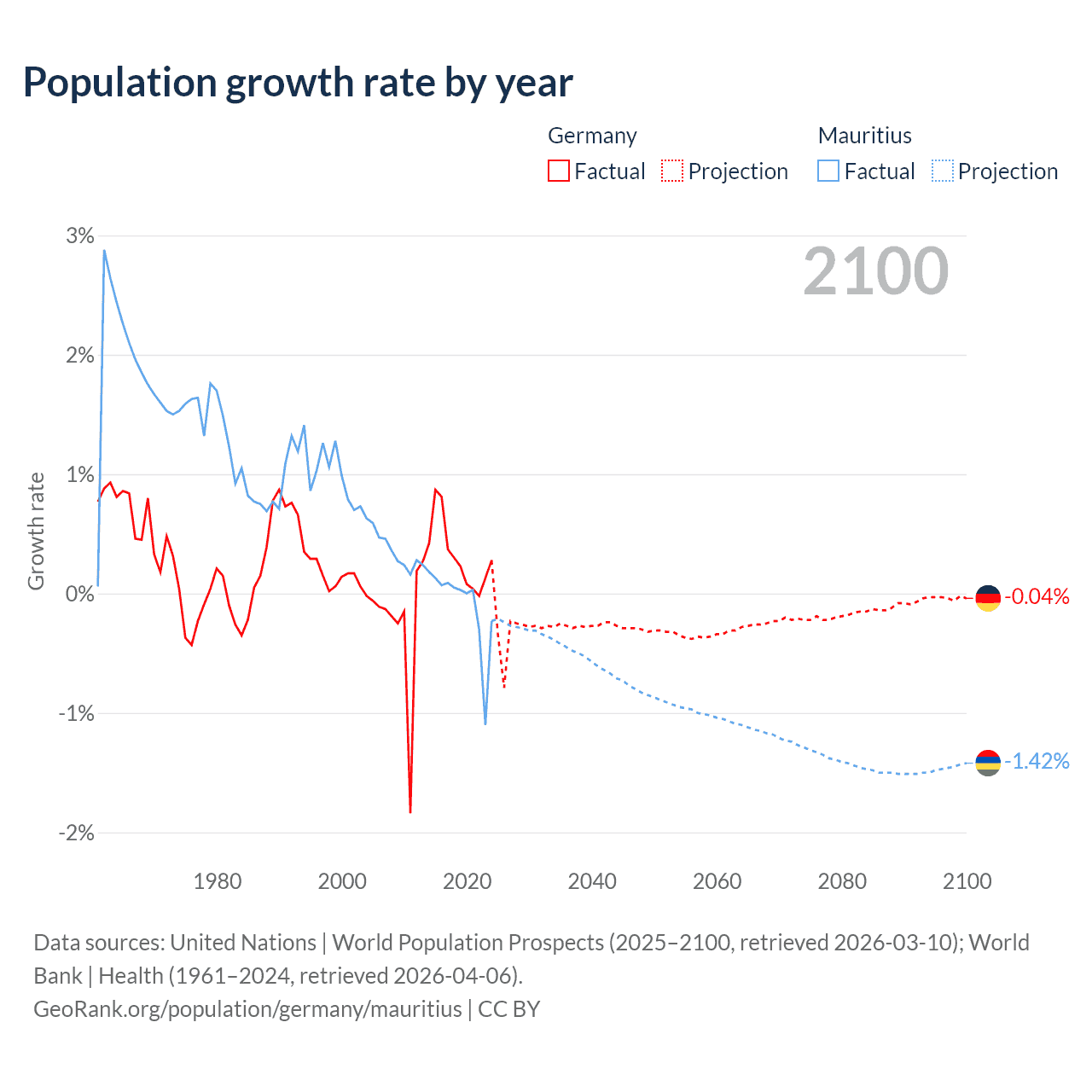 - For the last 10 years, Germany has had an average growth rate of +0.32% per year vs -0.09% in Mauritius.