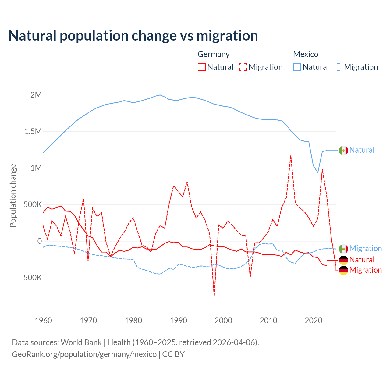 Over the last 10 years, 26.8% of the population change in Germany is from natural causes (a loss of 2,036,130 people) and 73.2% is from migration (a gain of 5,565,916 people). In Mexico 87.5% is from natural causes (a gain of 13,080,136 people) and 12.5% is from migration (a loss of 1,876,544 people).