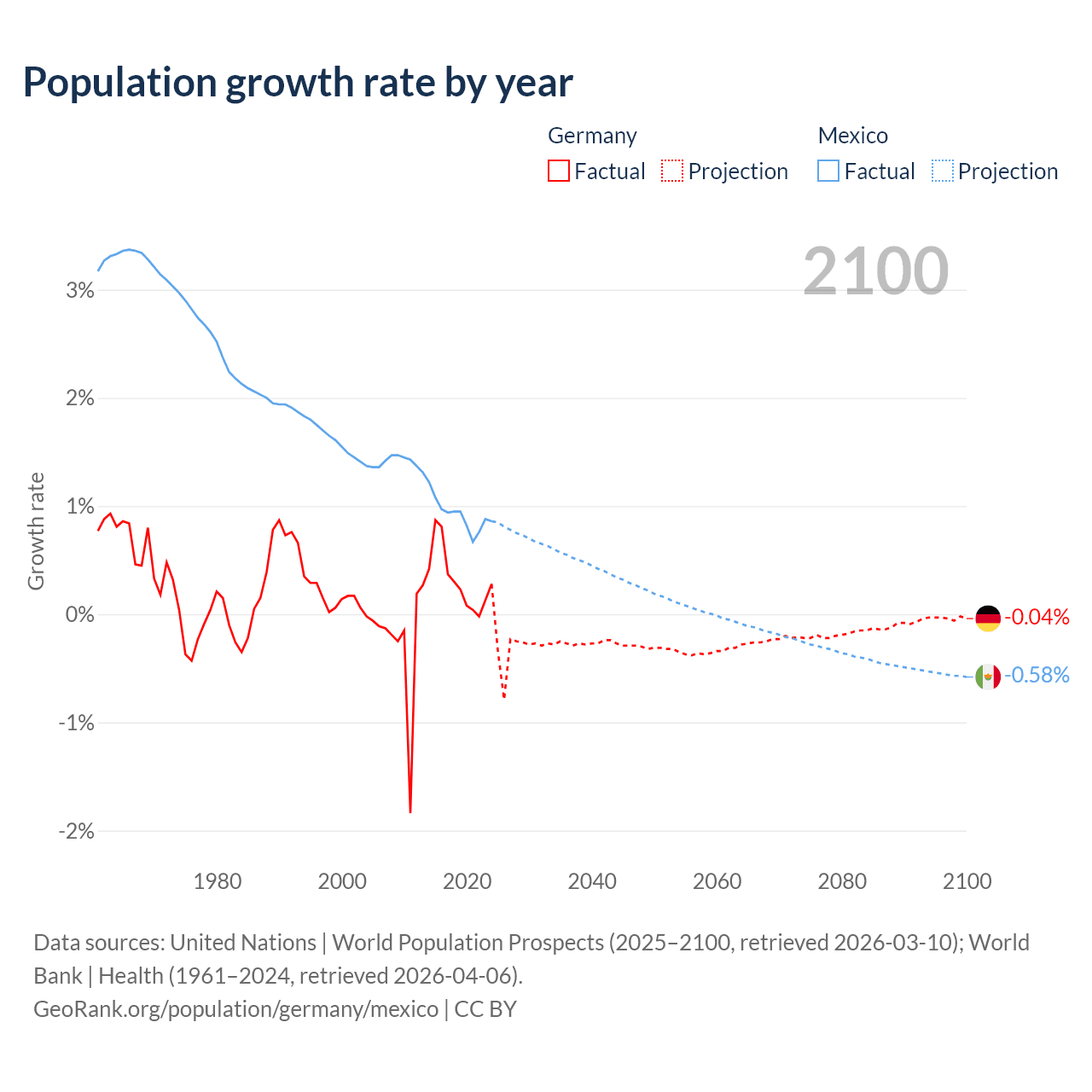 - For the last 10 years, Germany has had an average growth rate of +0.32% per year vs +0.92% in Mexico.