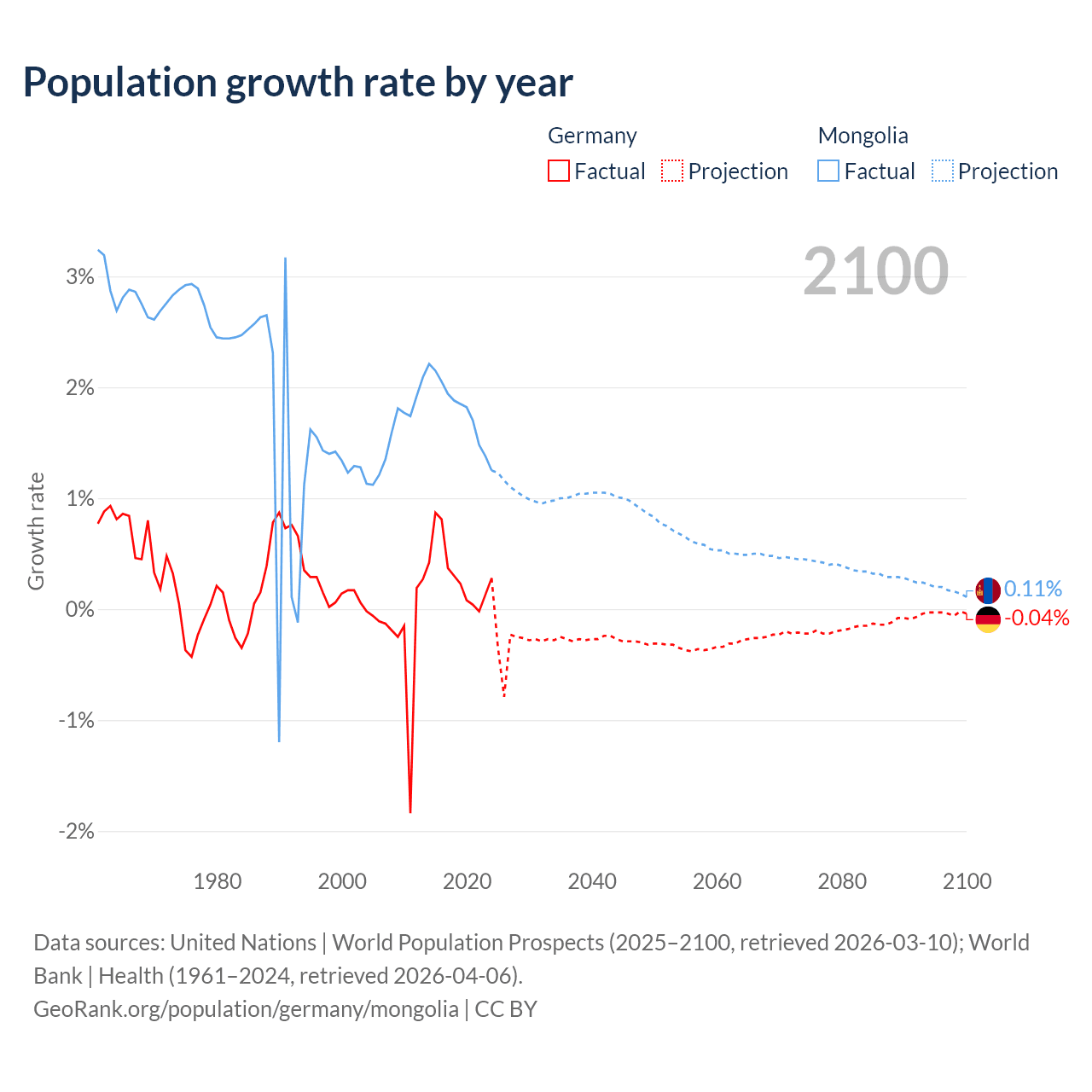 - For the last 10 years, Germany has had an average growth rate of +0.32% per year vs +1.79% in Mongolia.