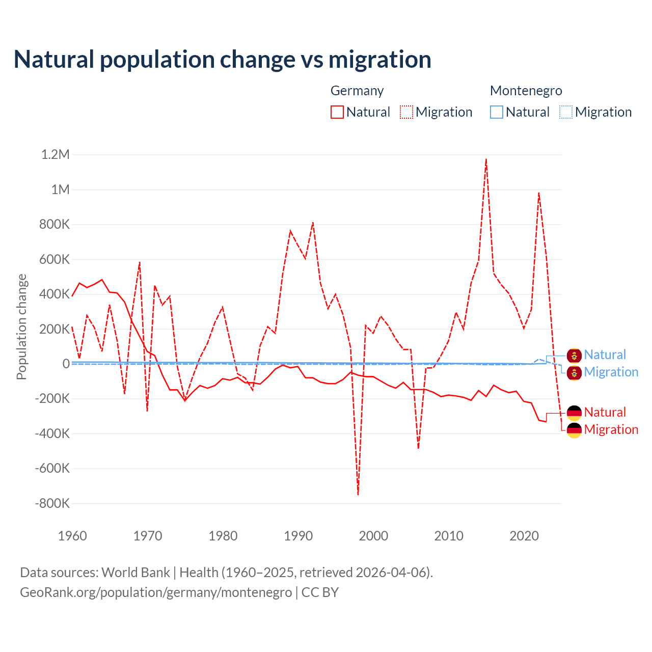 Over the last 10 years, 26.8% of the population change in Germany is from natural causes (a loss of 2,036,130 people) and 73.2% is from migration (a gain of 5,565,916 people). In Montenegro 52.4% is from natural causes (a gain of 4,501 people) and 47.6% is from migration (a gain of 4,095 people).