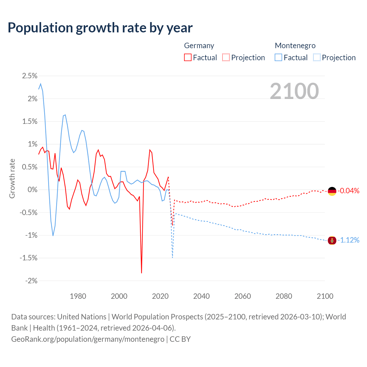 - For the last 10 years, Germany has had an average growth rate of +0.32% per year vs +0.01% in Montenegro.