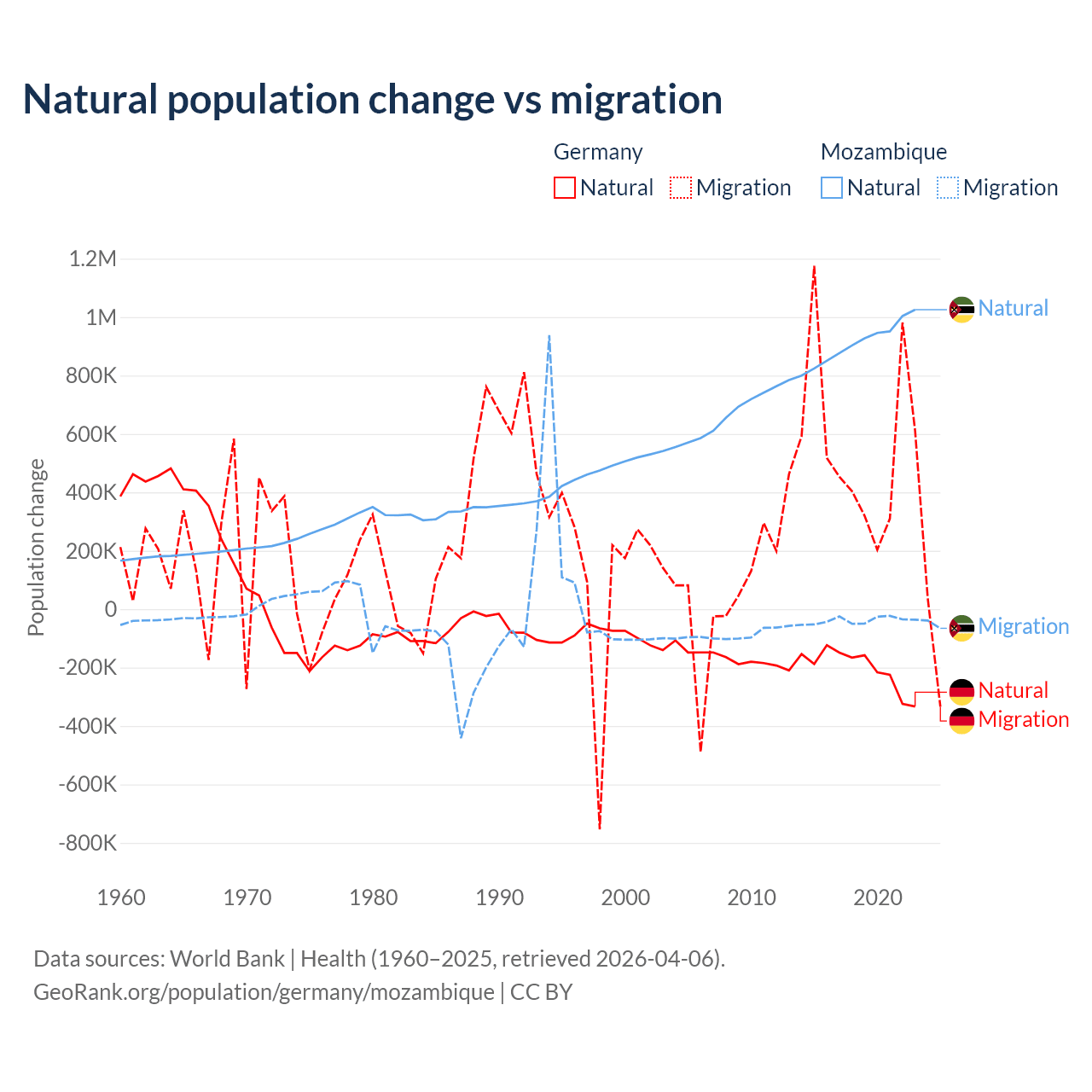 Over the last 10 years, 26.8% of the population change in Germany is from natural causes (a loss of 2,036,130 people) and 73.2% is from migration (a gain of 5,565,916 people). In Mozambique 95.9% is from natural causes (a gain of 9,108,203 people) and 4.15% is from migration (a loss of 393,923 people).