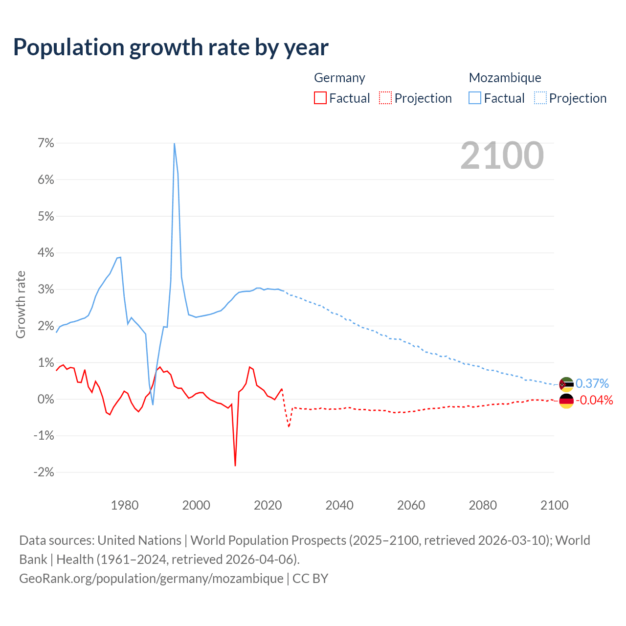 - For the last 10 years, Germany has had an average growth rate of +0.32% per year vs +2.99% in Mozambique.