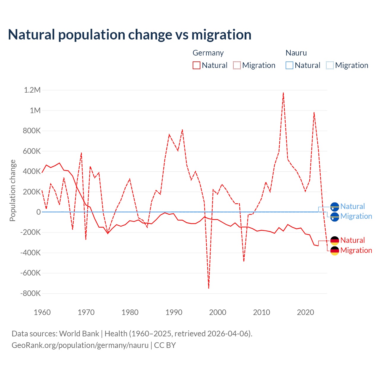 Over the last 10 years, 26.8% of the population change in Germany is from natural causes (a loss of 2,036,130 people) and 73.2% is from migration (a gain of 5,565,916 people). In Nauru 66.2% is from natural causes (a gain of 2,590 people) and 33.8% is from migration (a loss of 1,320 people).
