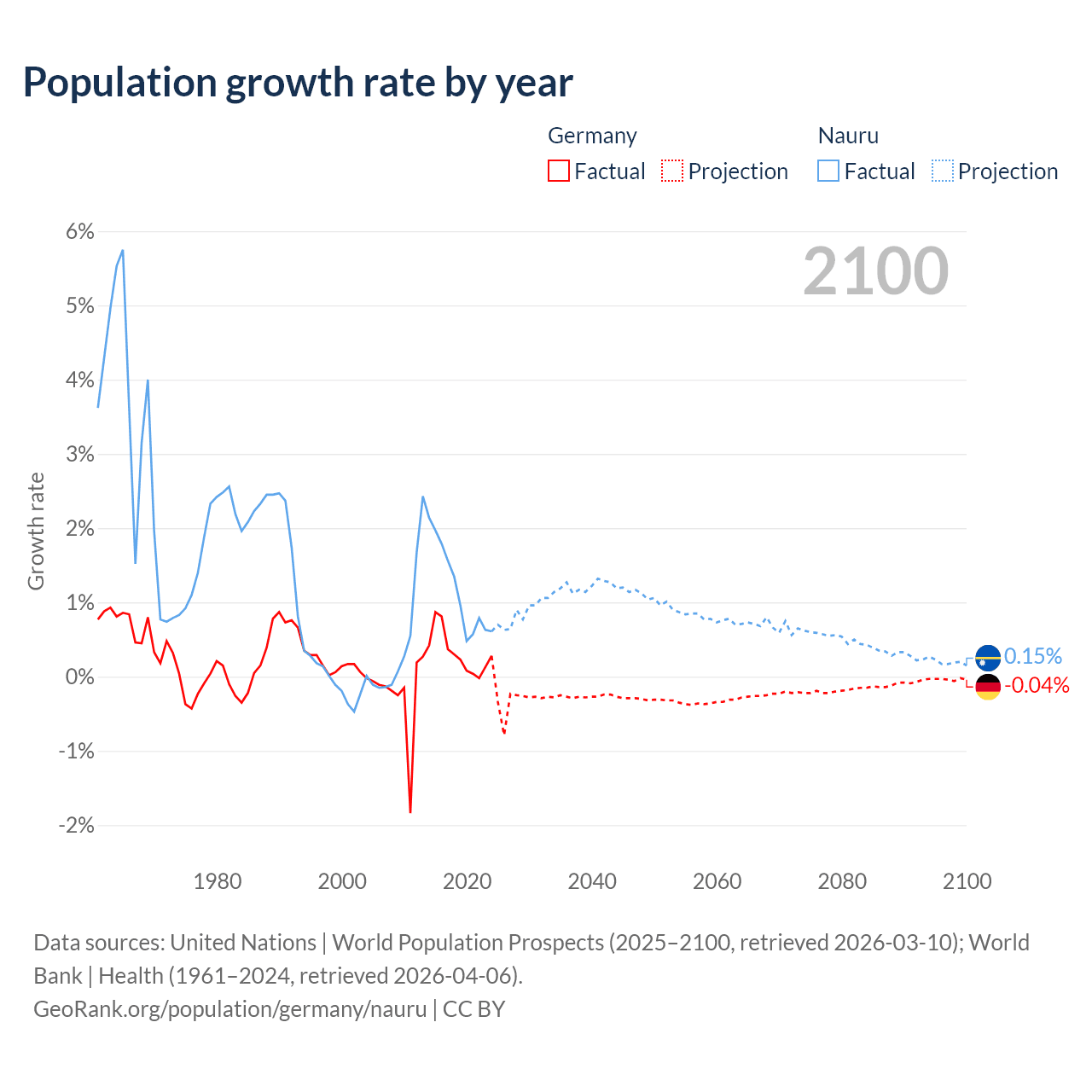 - For the last 10 years, Germany has had an average growth rate of +0.32% per year vs +1.17% in Nauru.