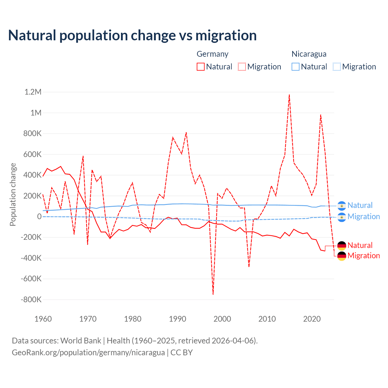 Over the last 10 years, 26.8% of the population change in Germany is from natural causes (a loss of 2,036,130 people) and 73.2% is from migration (a gain of 5,565,916 people). In Nicaragua 85.5% is from natural causes (a gain of 1,017,084 people) and 14.5% is from migration (a loss of 172,078 people).
