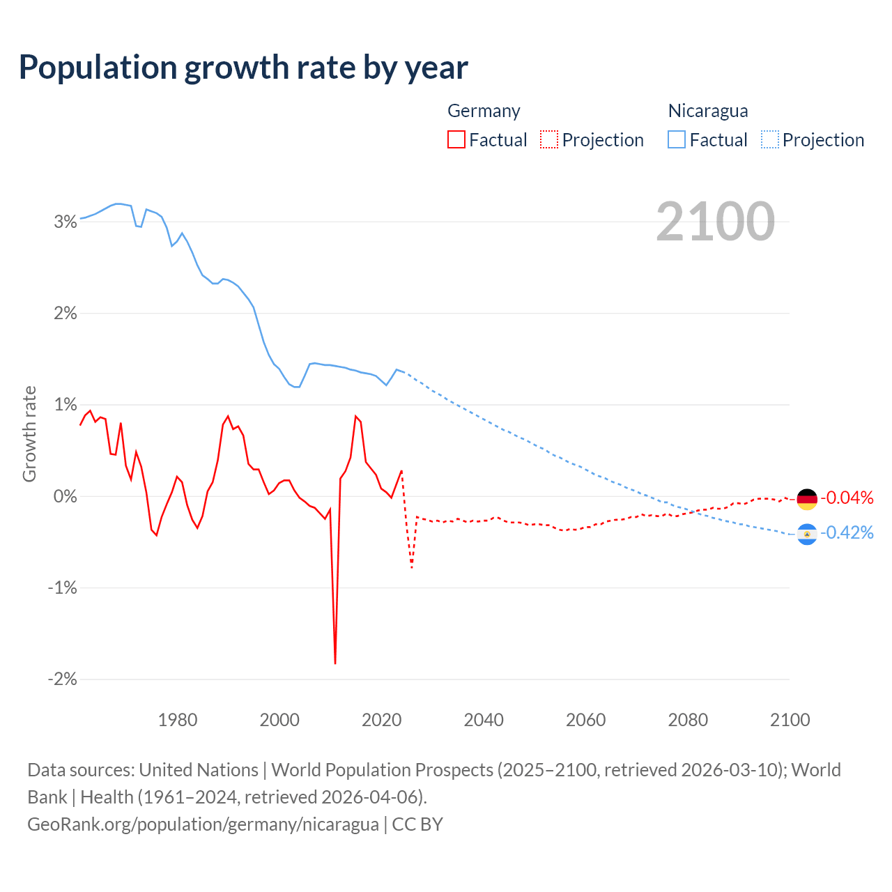 - For the last 10 years, Germany has had an average growth rate of +0.32% per year vs +1.33% in Nicaragua.