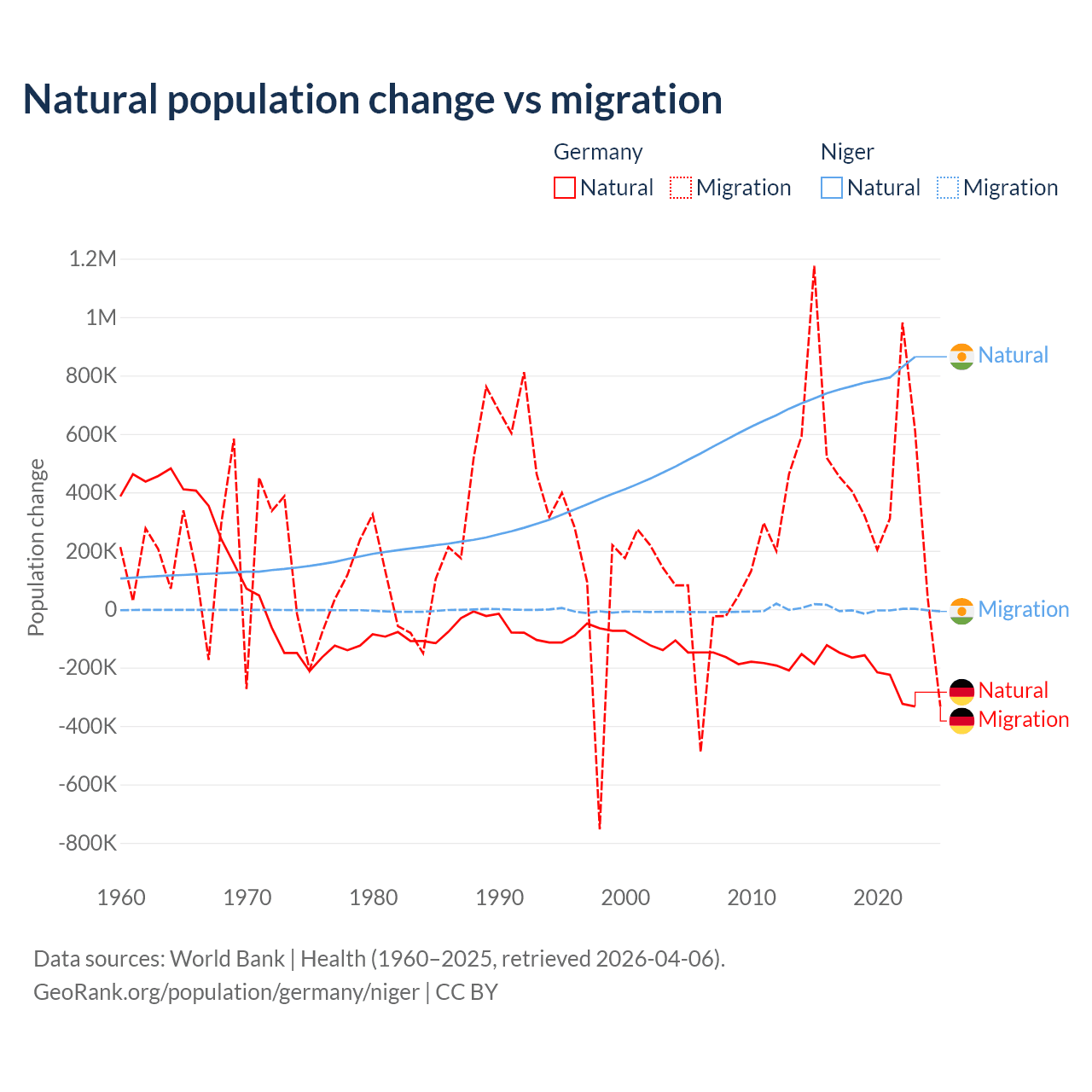 Over the last 10 years, 26.8% of the population change in Germany is from natural causes (a loss of 2,036,130 people) and 73.2% is from migration (a gain of 5,565,916 people). In Niger 100% is from natural causes (a gain of 7,728,287 people) and 0.03% is from migration (a gain of 2,520 people).
