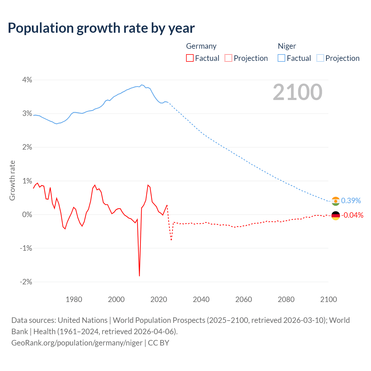 - For the last 10 years, Germany has had an average growth rate of +0.32% per year vs +3.5% in Niger.