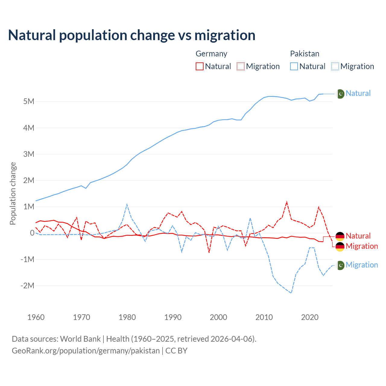 Over the last 10 years, 26.8% of the population change in Germany is from natural causes (a loss of 2,036,130 people) and 73.2% is from migration (a gain of 5,565,916 people). In Pakistan 77.8% is from natural causes (a gain of 51,255,404 people) and 22.2% is from migration (a loss of 14,629,055 people).