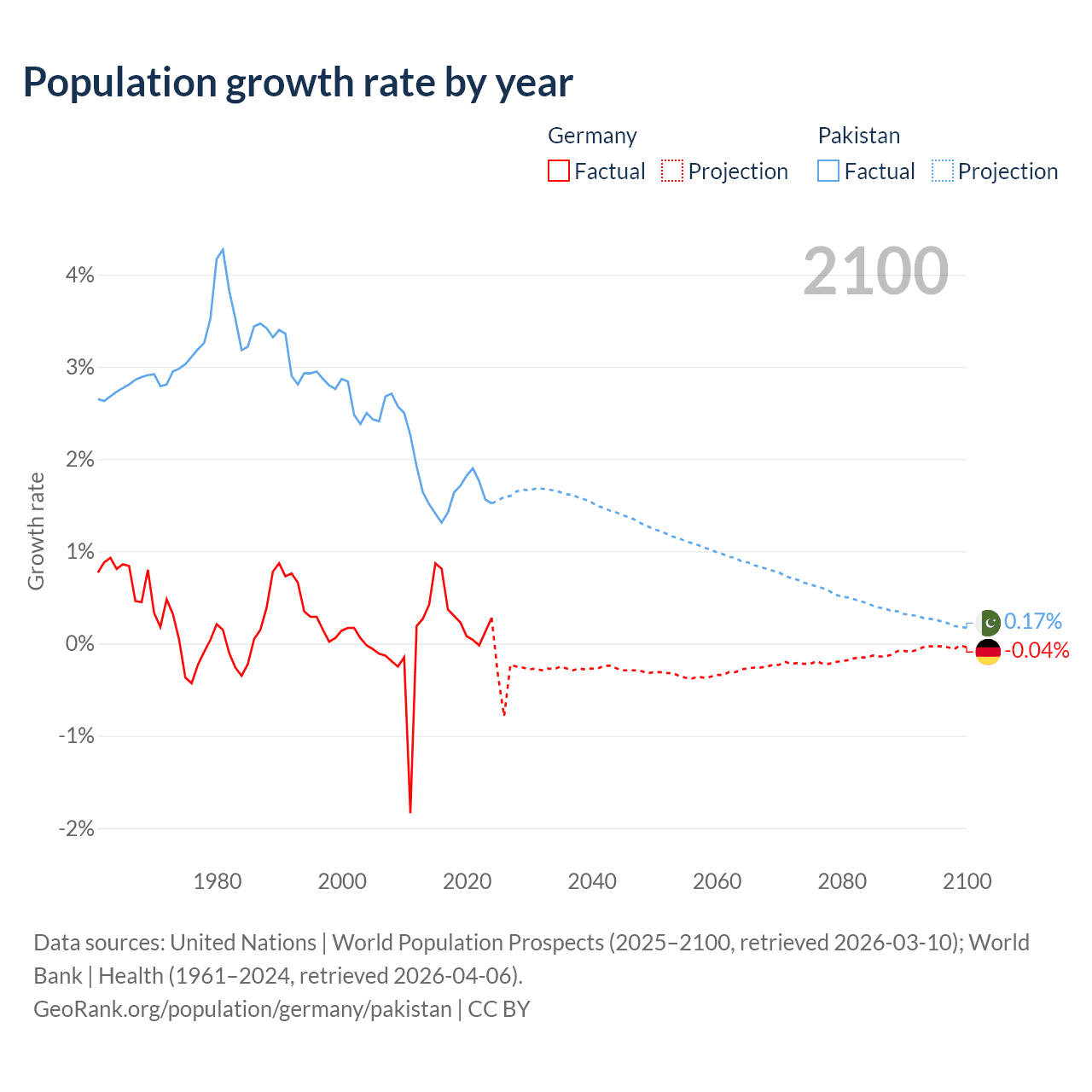 - For the last 10 years, Germany has had an average growth rate of +0.32% per year vs +1.6% in Pakistan.
