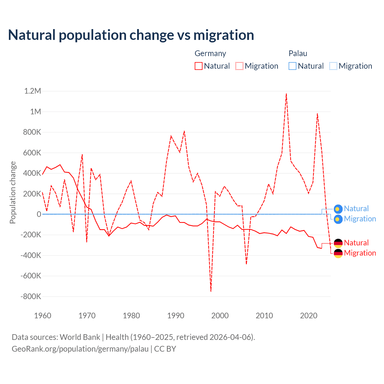 Over the last 10 years, 26.8% of the population change in Germany is from natural causes (a loss of 2,036,130 people) and 73.2% is from migration (a gain of 5,565,916 people). In Palau 53.8% is from natural causes (a gain of 264 people) and 46.2% is from migration (a loss of 227 people).
