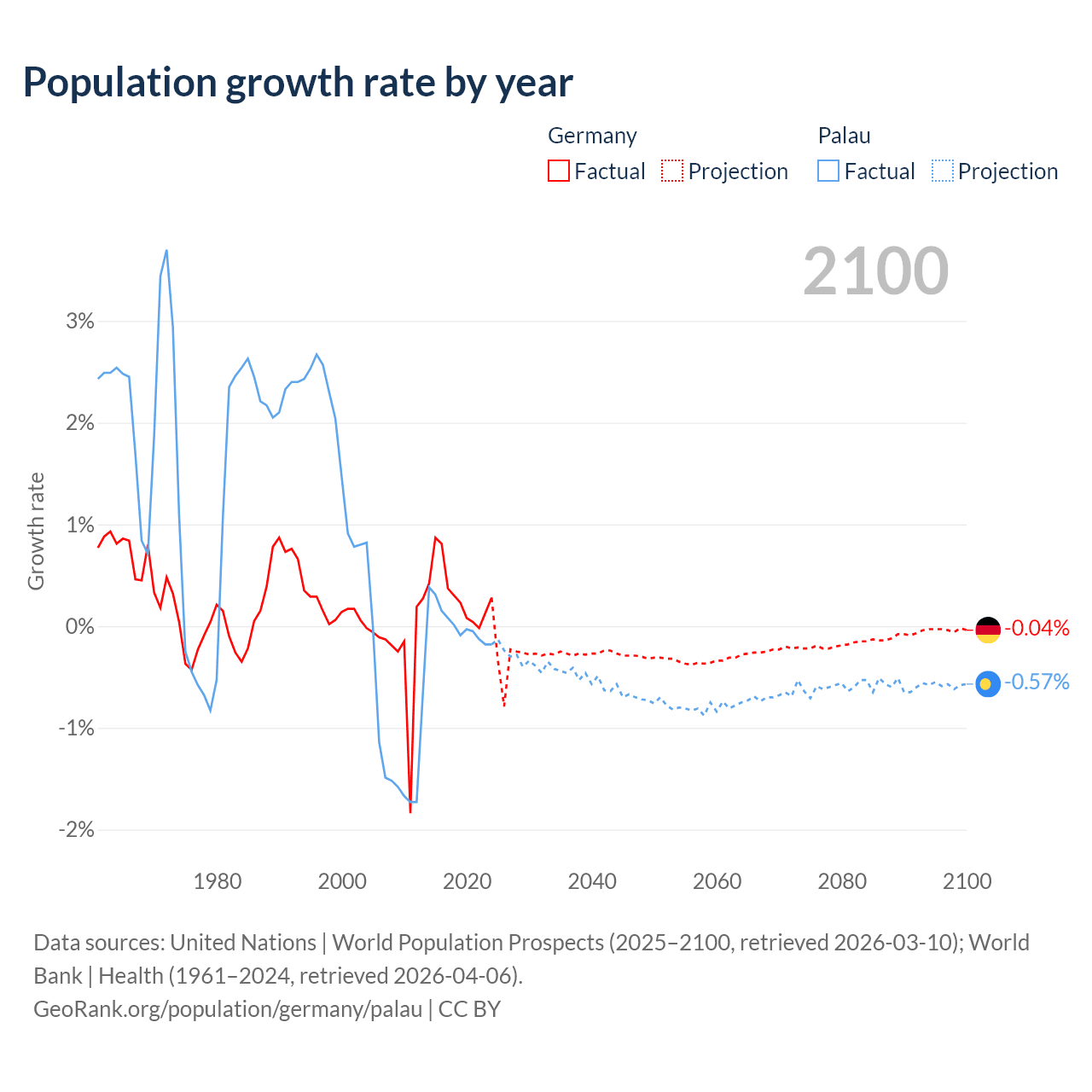 - For the last 10 years, Germany has had an average growth rate of +0.32% per year vs +0.02% in Palau.