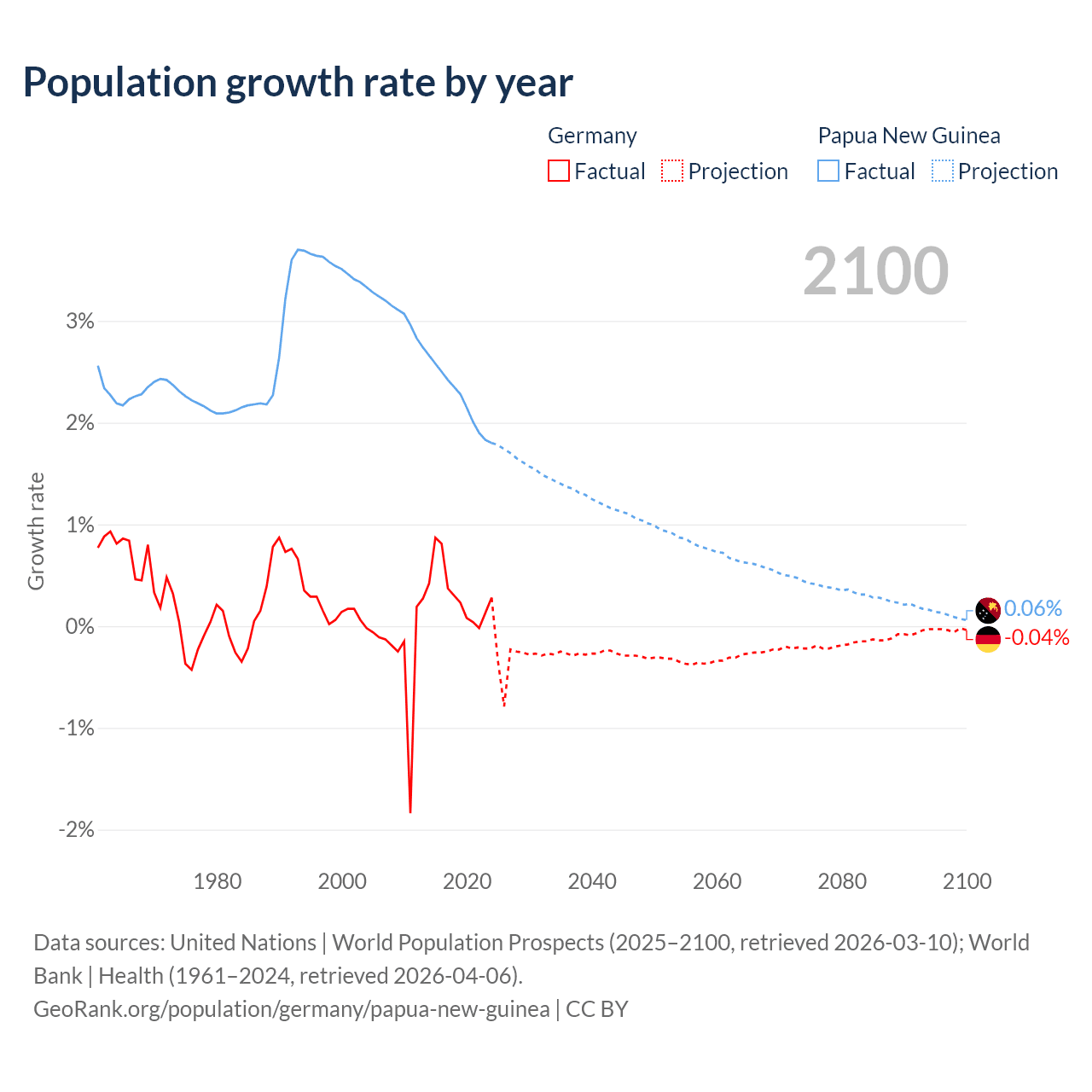 - For the last 10 years, Germany has had an average growth rate of +0.32% per year vs +2.23% in Papua New Guinea.