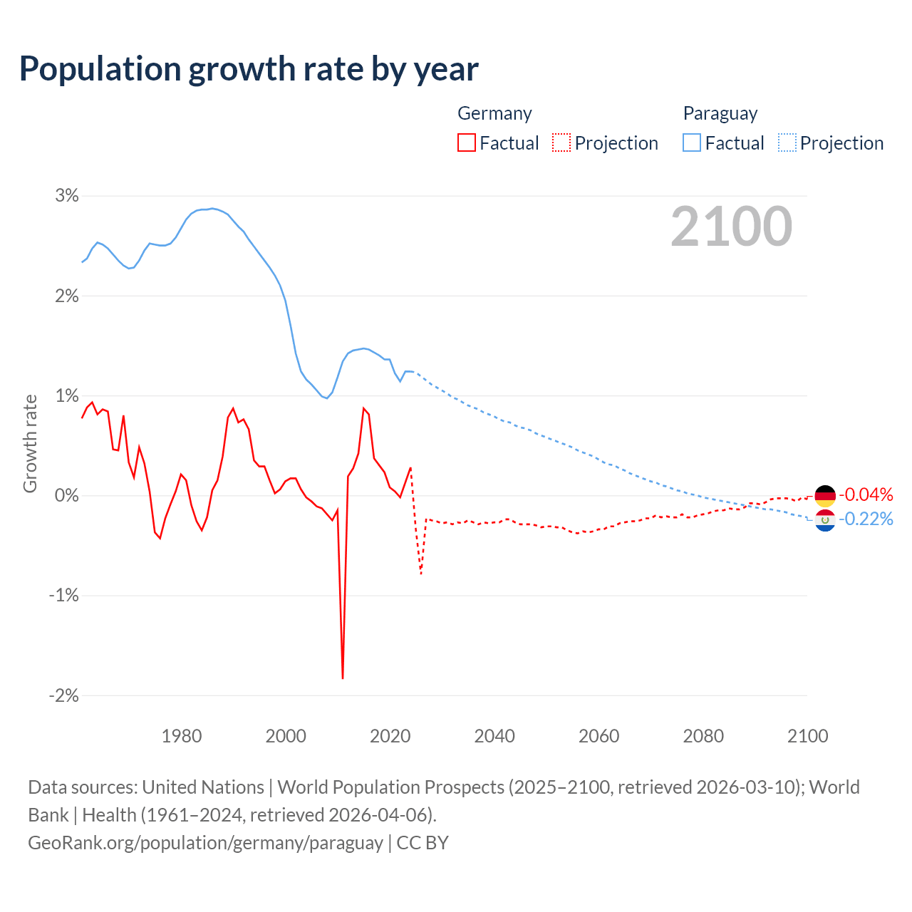 - For the last 10 years, Germany has had an average growth rate of +0.32% per year vs +1.34% in Paraguay.