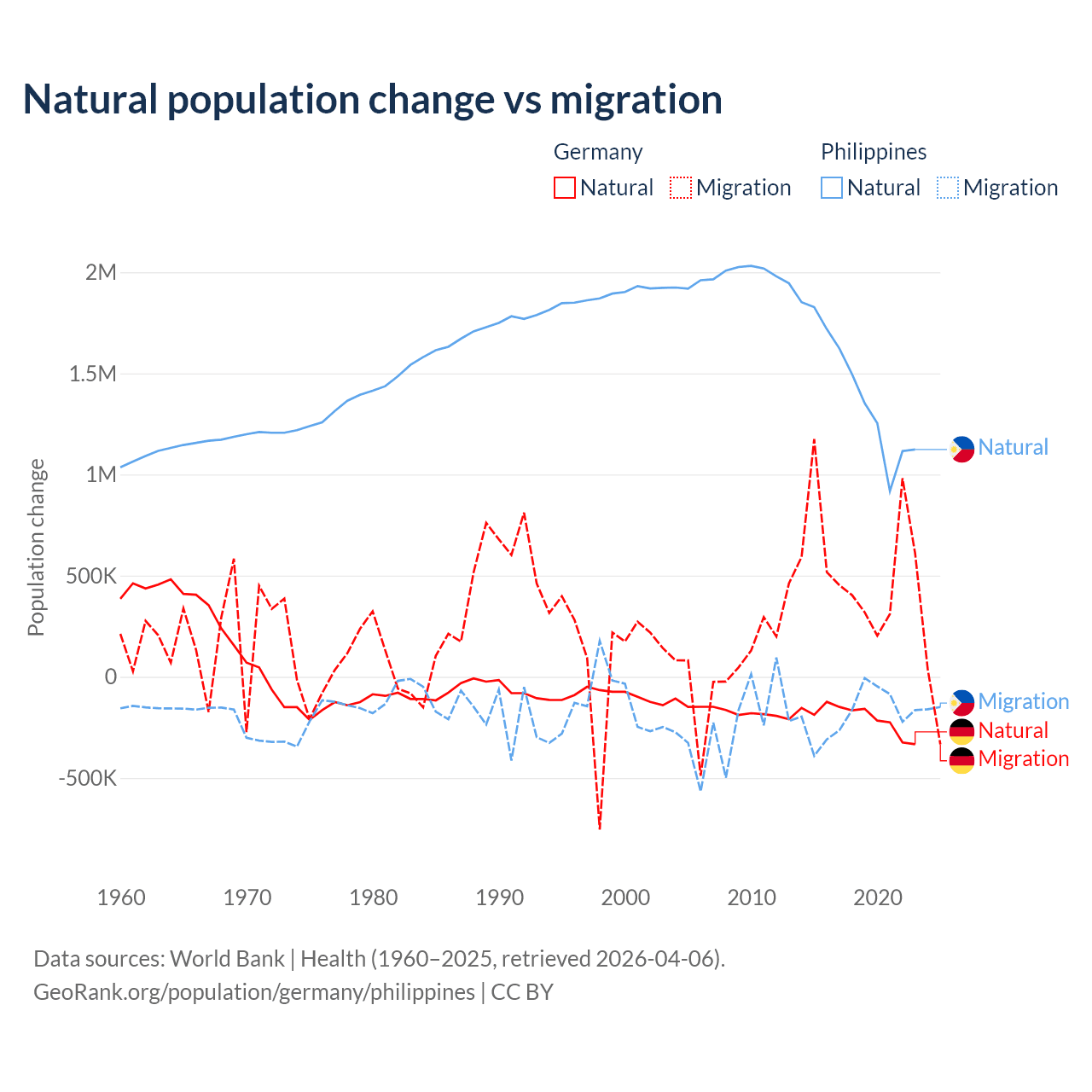 Over the last 10 years, 26.8% of the population change in Germany is from natural causes (a loss of 2,036,130 people) and 73.2% is from migration (a gain of 5,565,916 people). In the Philippines 88.5% is from natural causes (a gain of 14,279,705 people) and 11.5% is from migration (a loss of 1,848,117 people).
