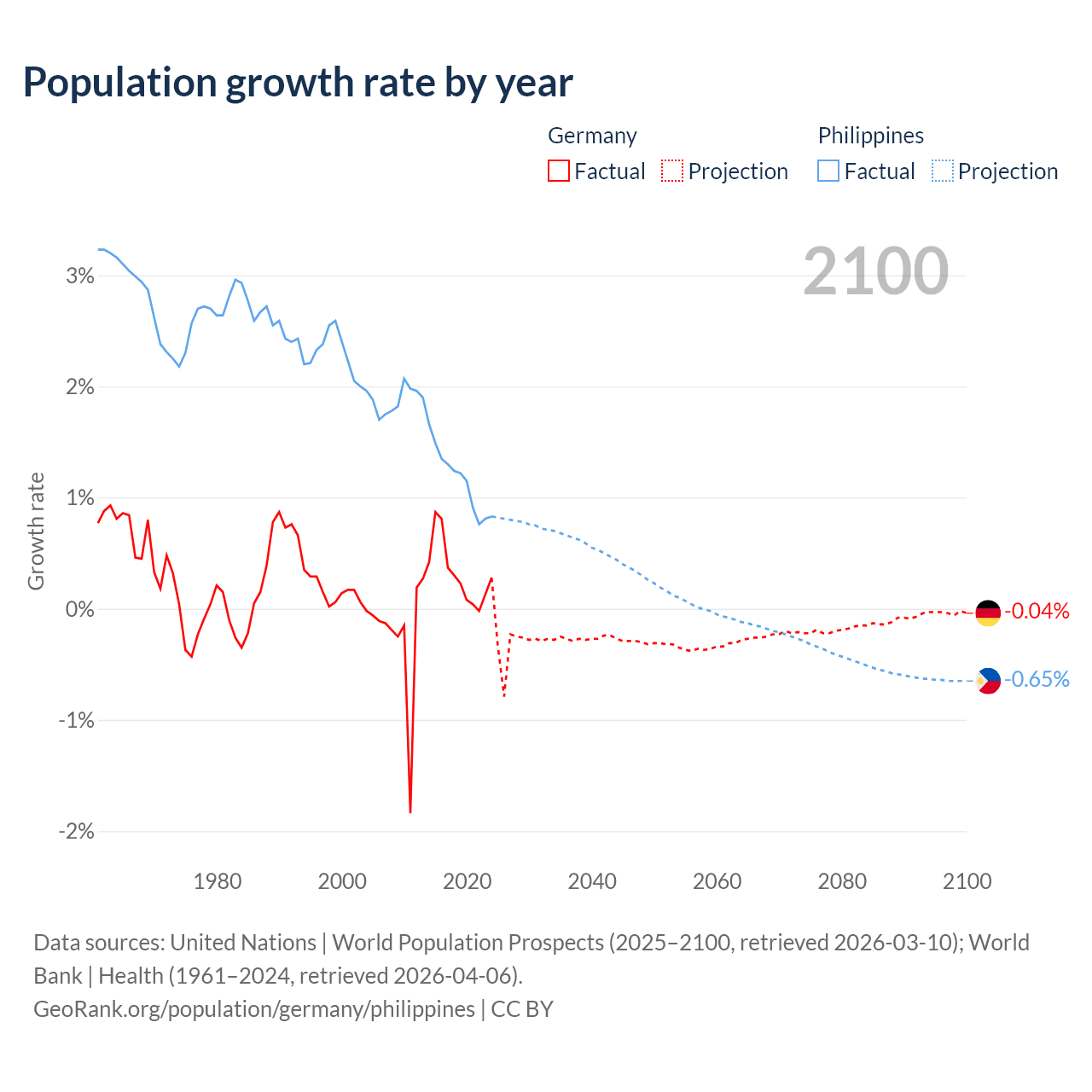 - For the last 10 years, Germany has had an average growth rate of +0.32% per year vs +1.16% in the Philippines.