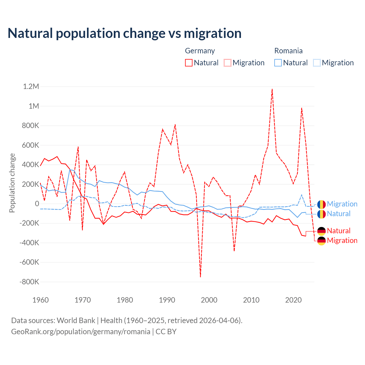 Over the last 10 years, 26.8% of the population change in Germany is from natural causes (a loss of 2,036,130 people) and 73.2% is from migration (a gain of 5,565,916 people). In Romania 82% is from natural causes (a loss of 766,295 people) and 18% is from migration (a loss of 167,917 people).