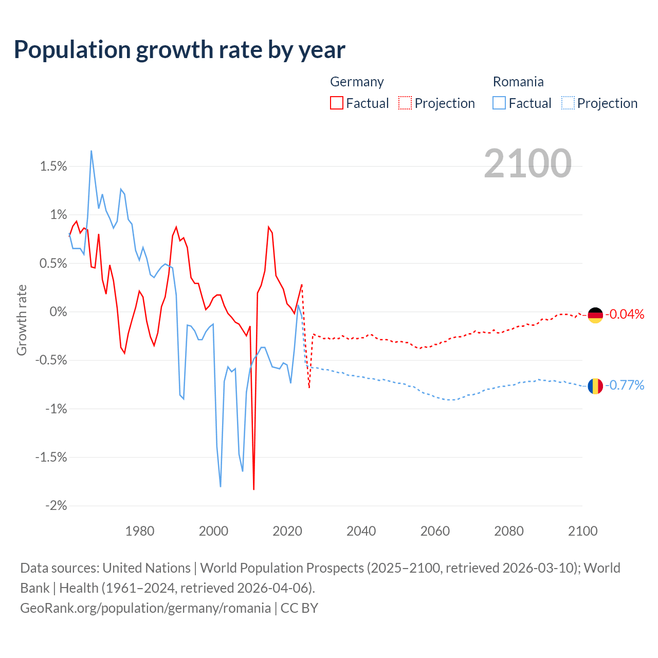 - For the last 10 years, Germany has had an average growth rate of +0.32% per year vs -0.43% in Romania.