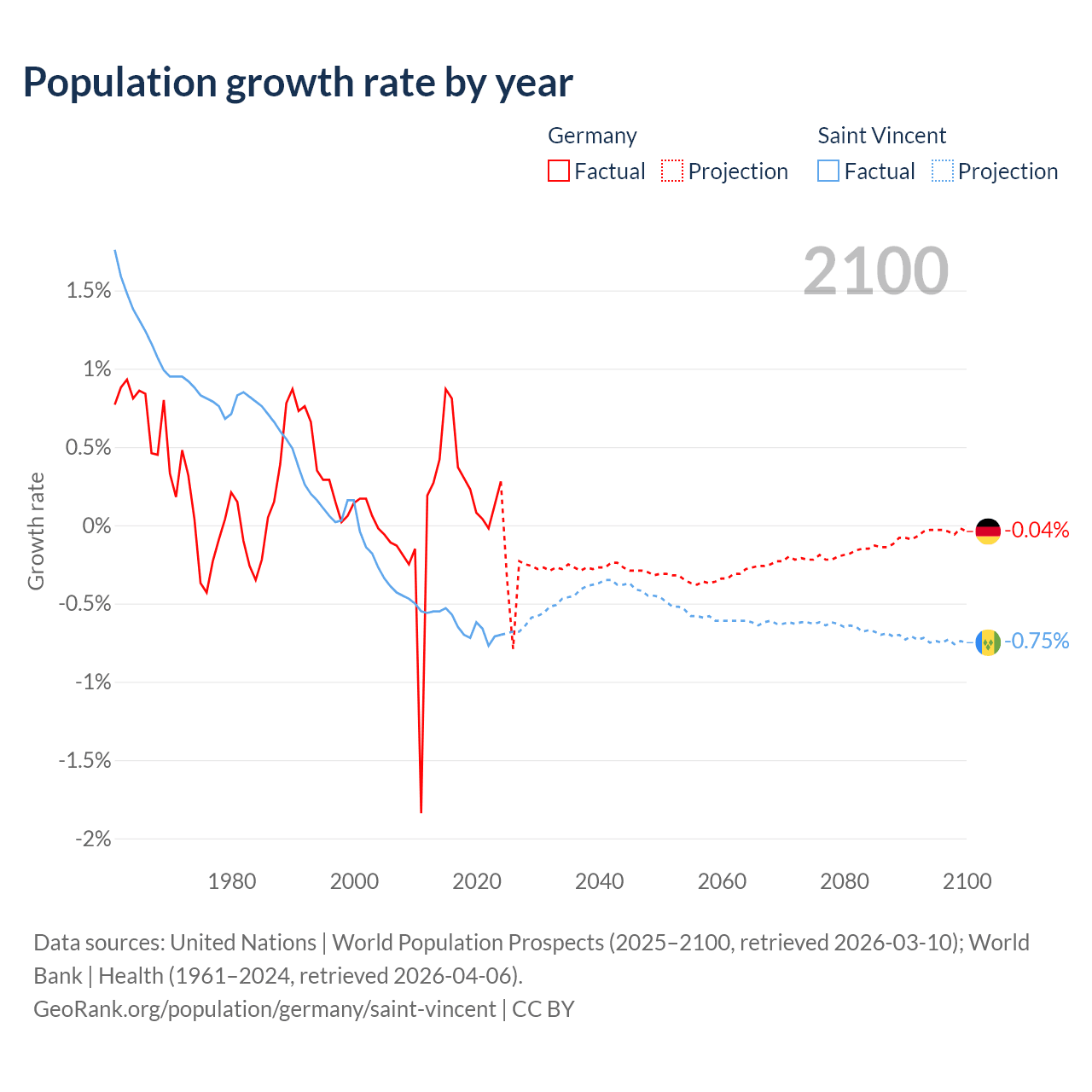 - For the last 10 years, Germany has had an average growth rate of +0.32% per year vs -0.65% in Saint Vincent.