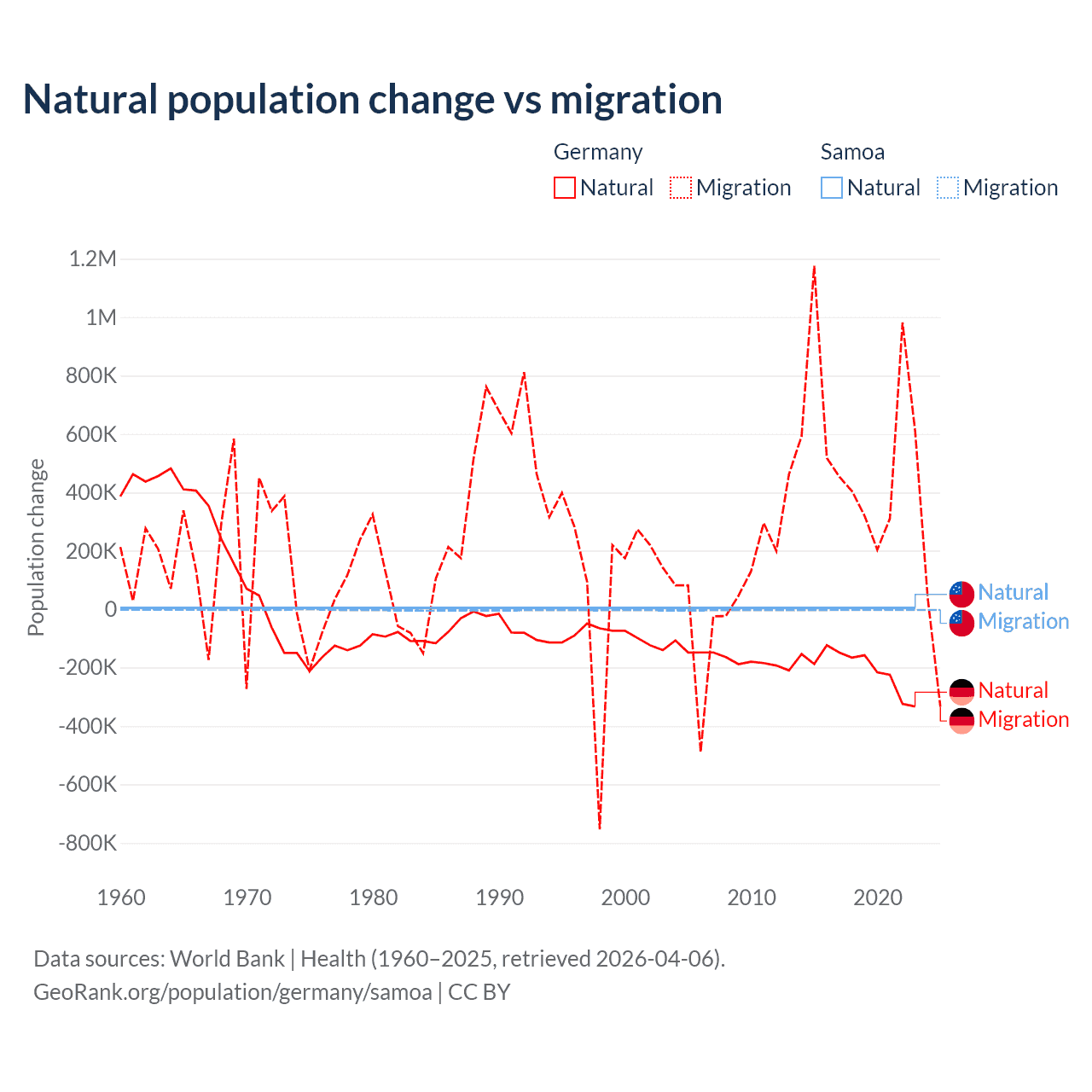 Over the last 10 years, 26.8% of the population change in Germany is from natural causes (a loss of 2,036,130 people) and 73.2% is from migration (a gain of 5,565,916 people). In Samoa 62.5% is from natural causes (a gain of 45,436 people) and 37.5% is from migration (a loss of 27,246 people).