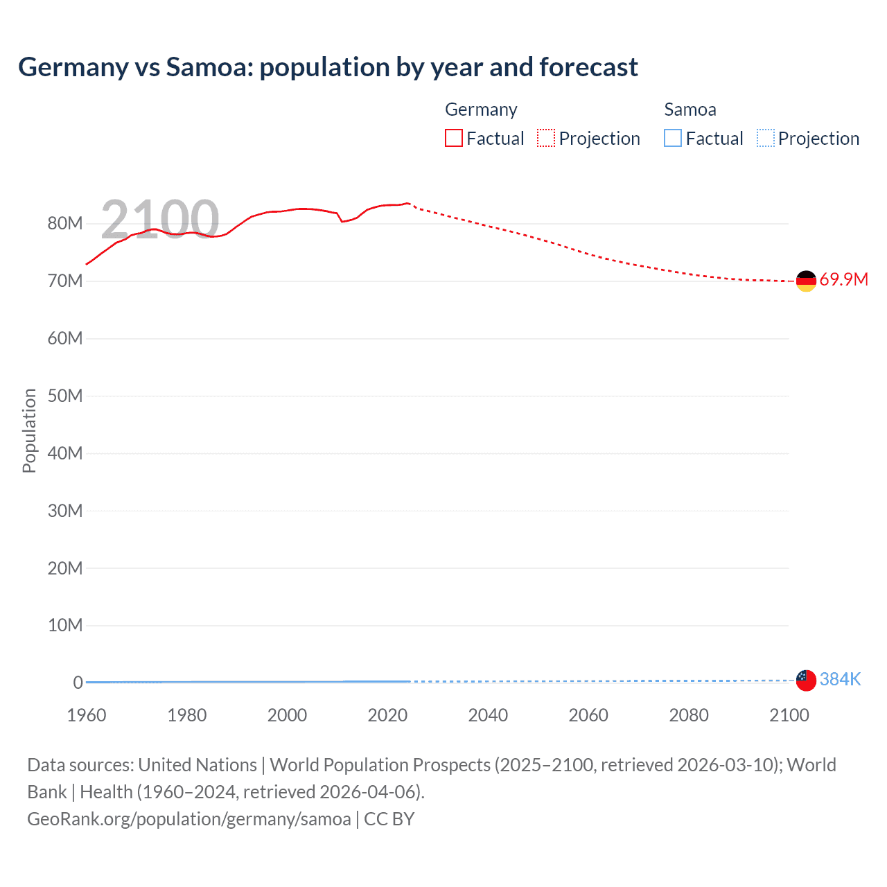 The latest officially reported population of Germany was 83,516,593 in 2024 vs 218,019 people in Samoa in 2024. In 2026, based on the adjusted UN estimation, the current Germany's population is 82,575,542 people compared to 220,932 in Samoa.
